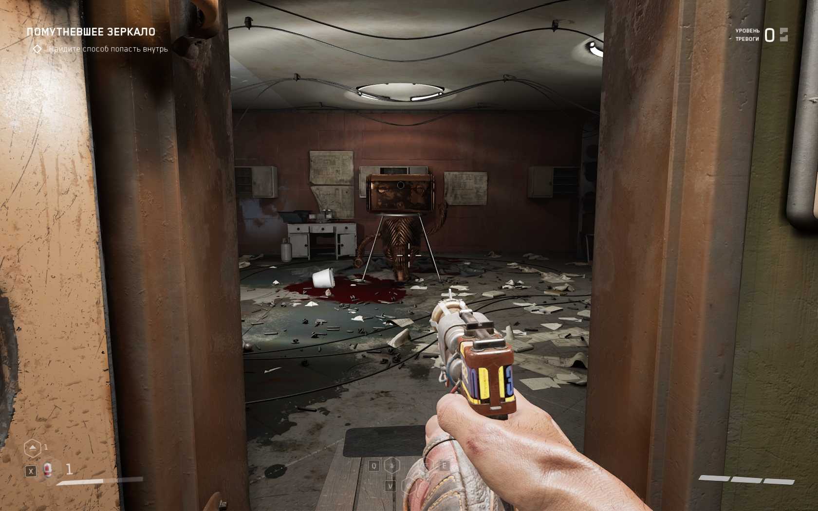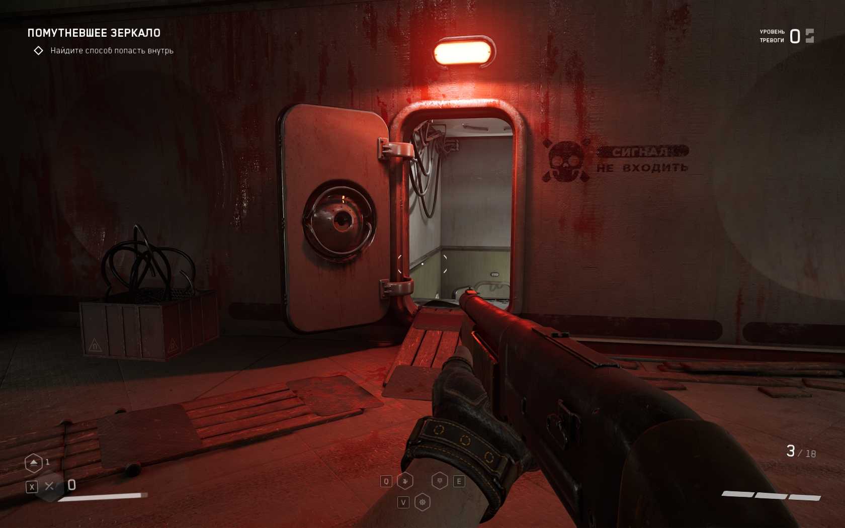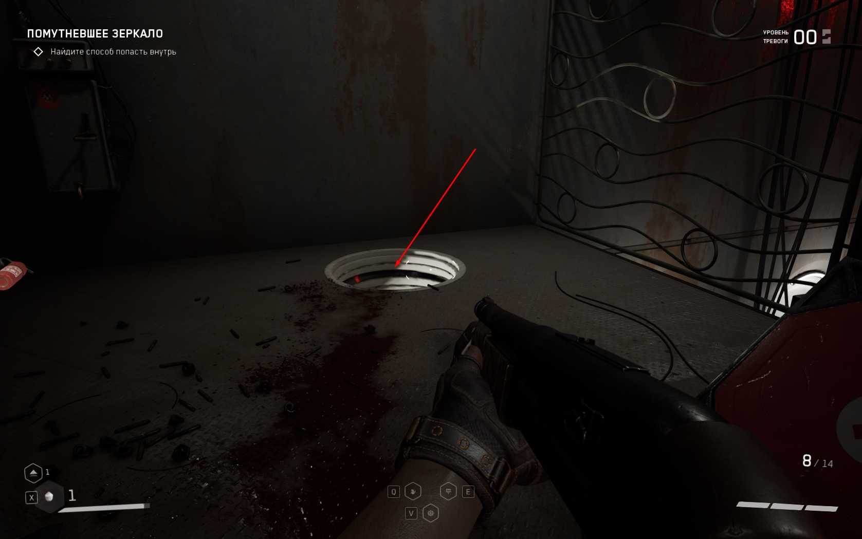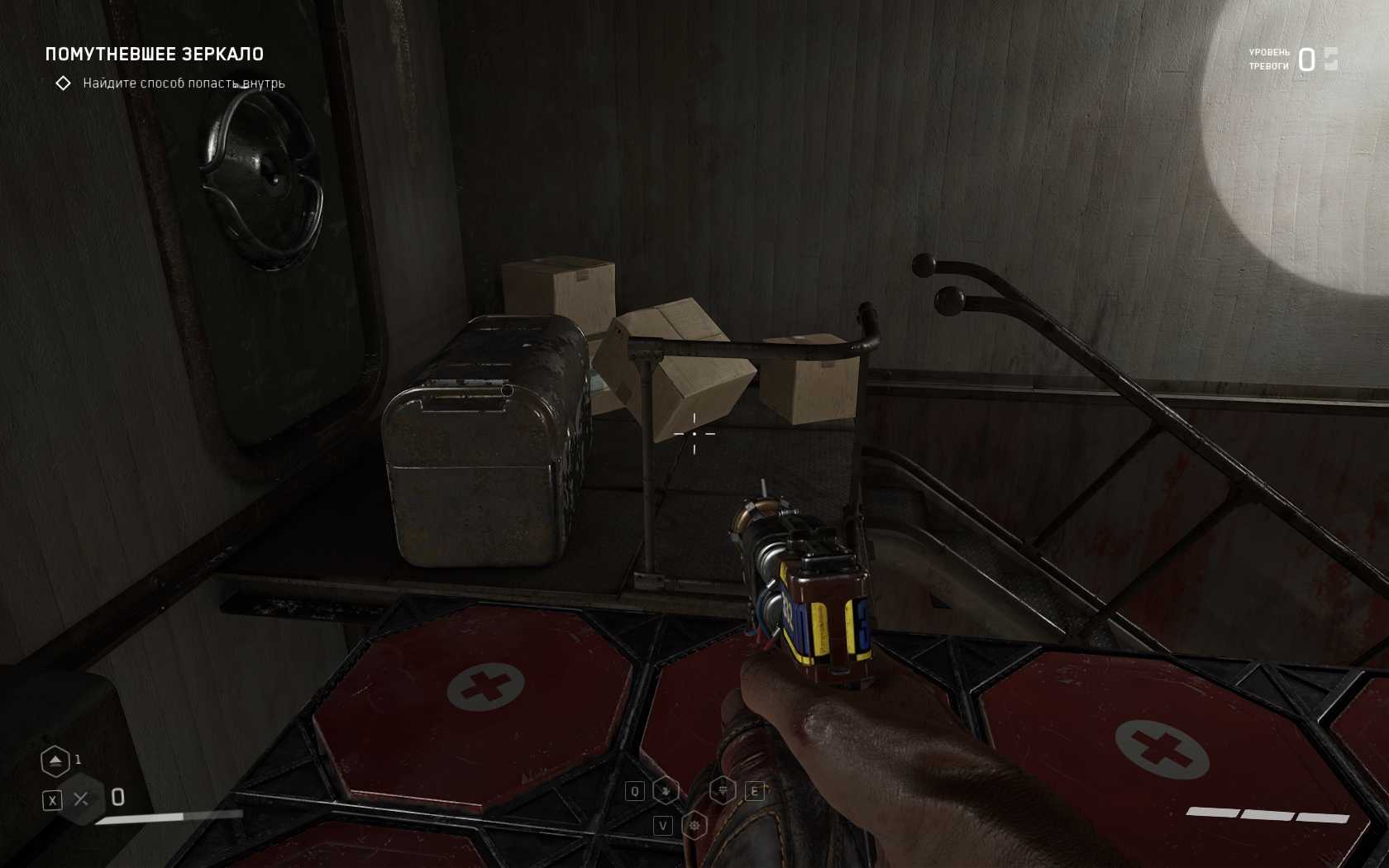 | 8 | Справа за дверью ничего нет, поэтому идите налево через пролом в стене. Там будет лестница и комната с Товарищем Лутягиным (чертеж «ПМ – увеличенный магазин») |   |