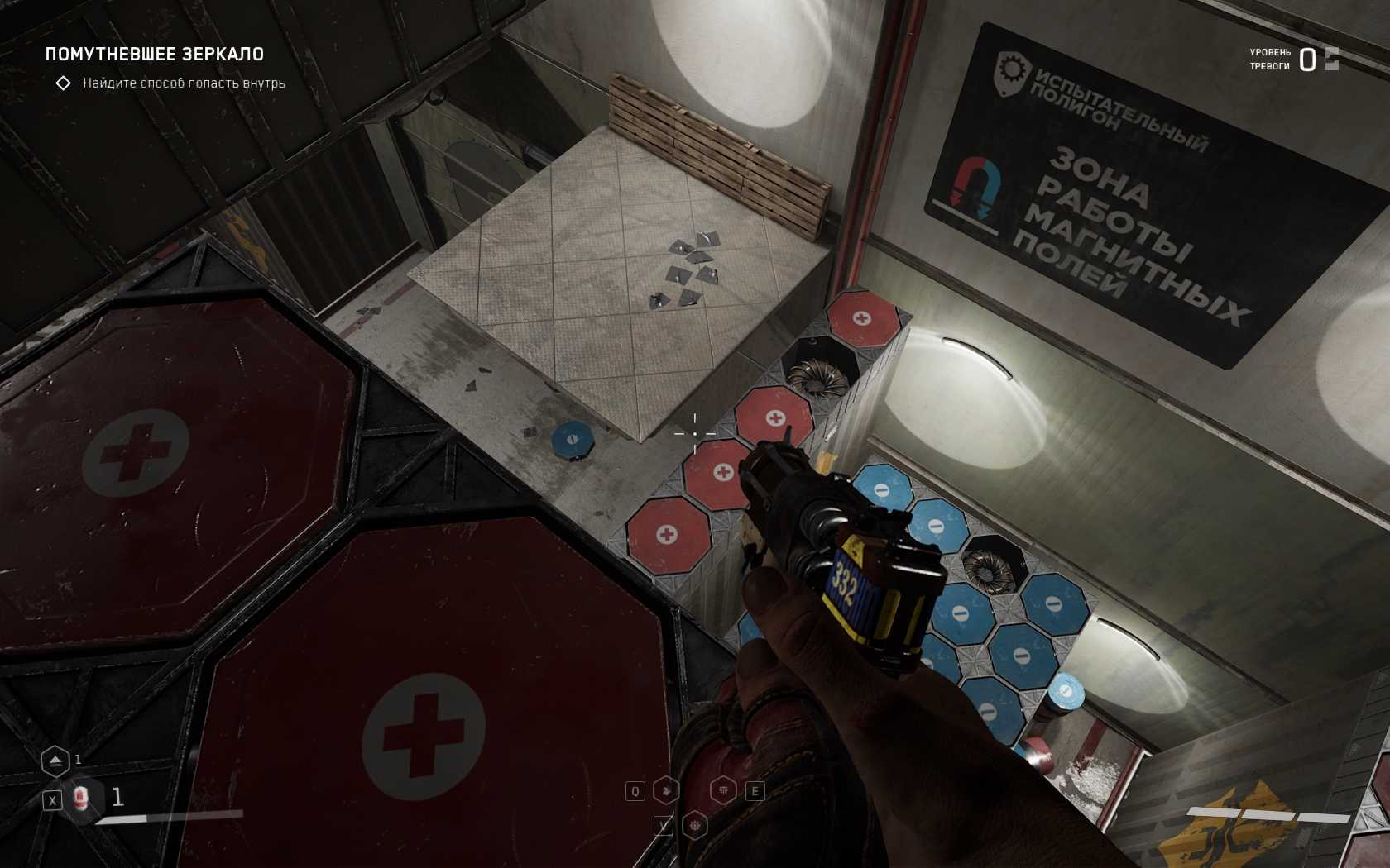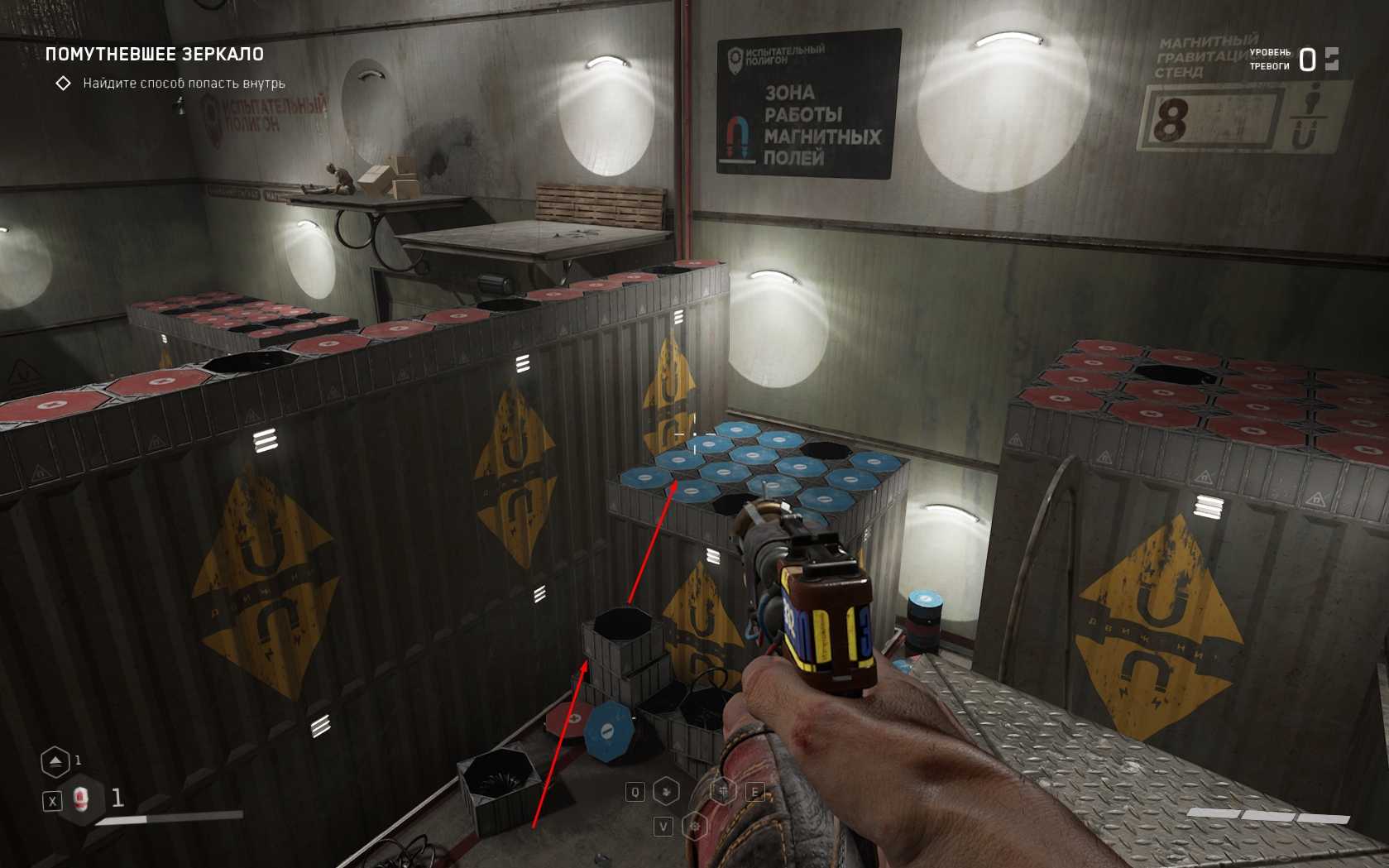 | 1 | Спуститесь на лифте на нижний уровень Полигона. В коридоре слева есть безопасная комната, справа зона магнитных полей, а в конце за поворотом – несколько шкафчиков, доступных для обыска |   |