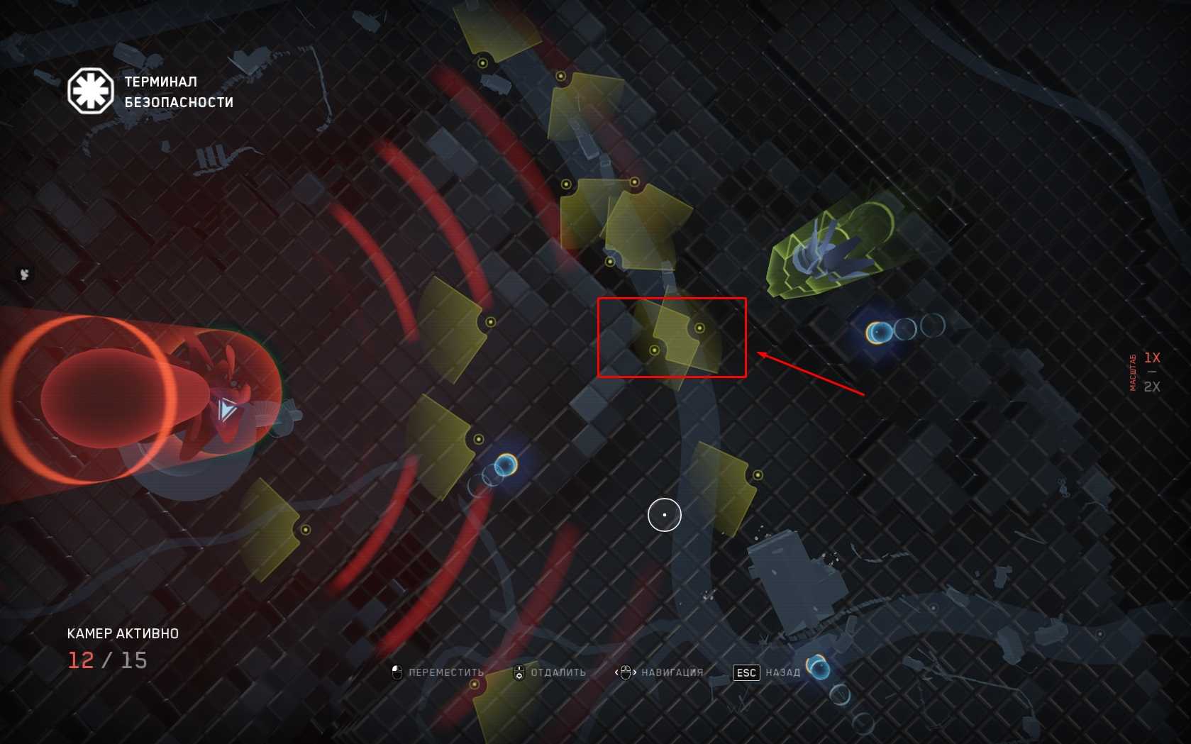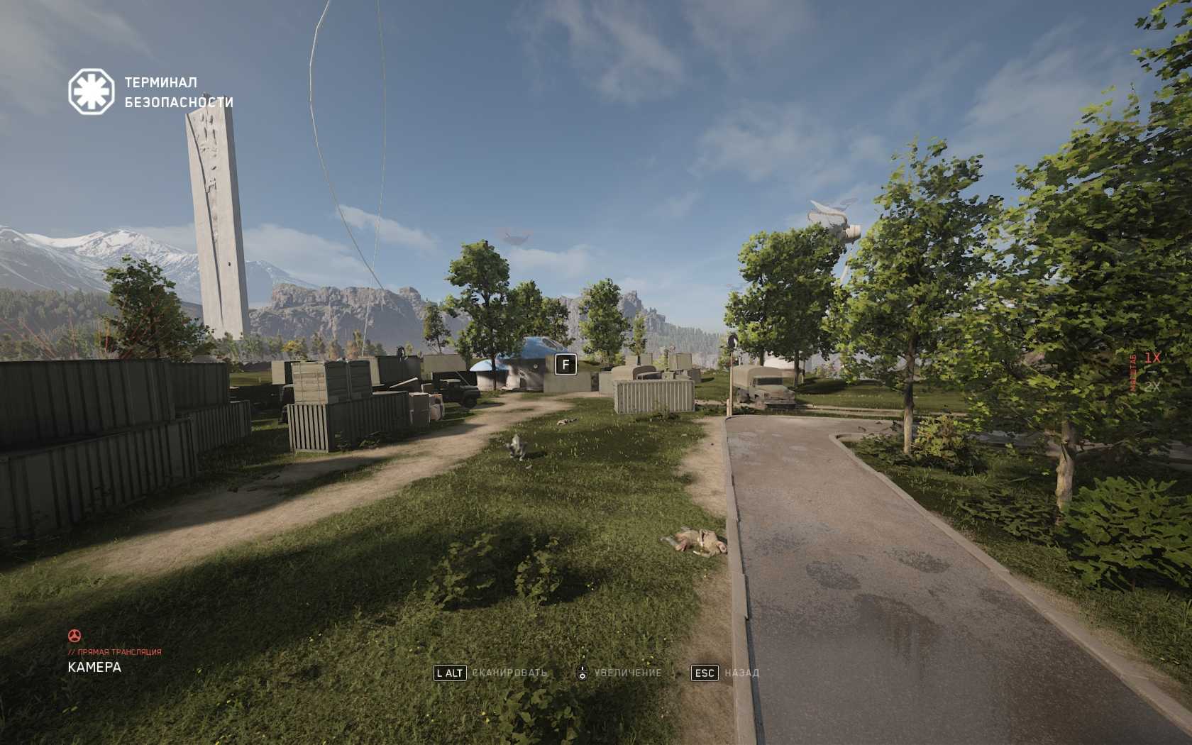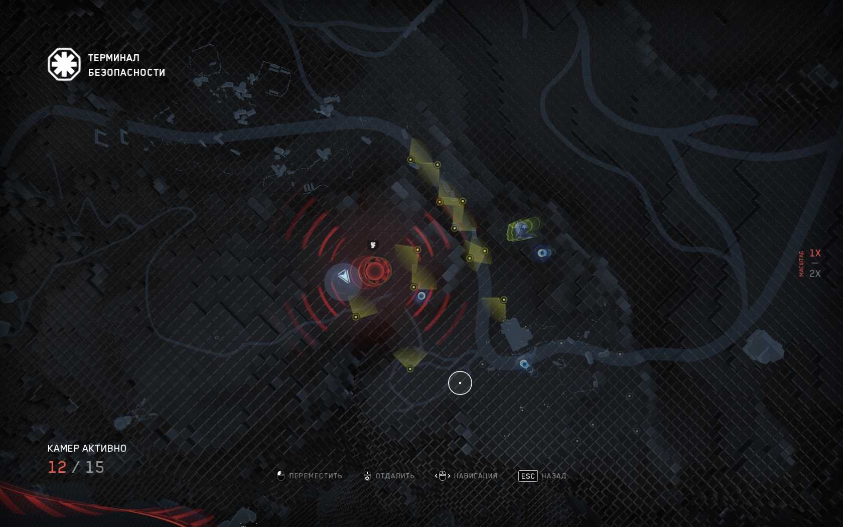 Выберите любой или какой-то конкретный терминал безопасности, чтобы использовать его для осмотра территории. С помощью терминала можно сканировать окружение, приближать и отдалять камеру. Также он позволяет взаимодействовать с некоторыми объектами, к примеру, с воротами, которые преграждают главную дорогу.