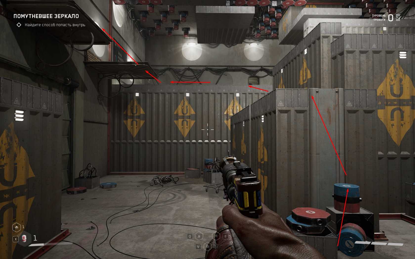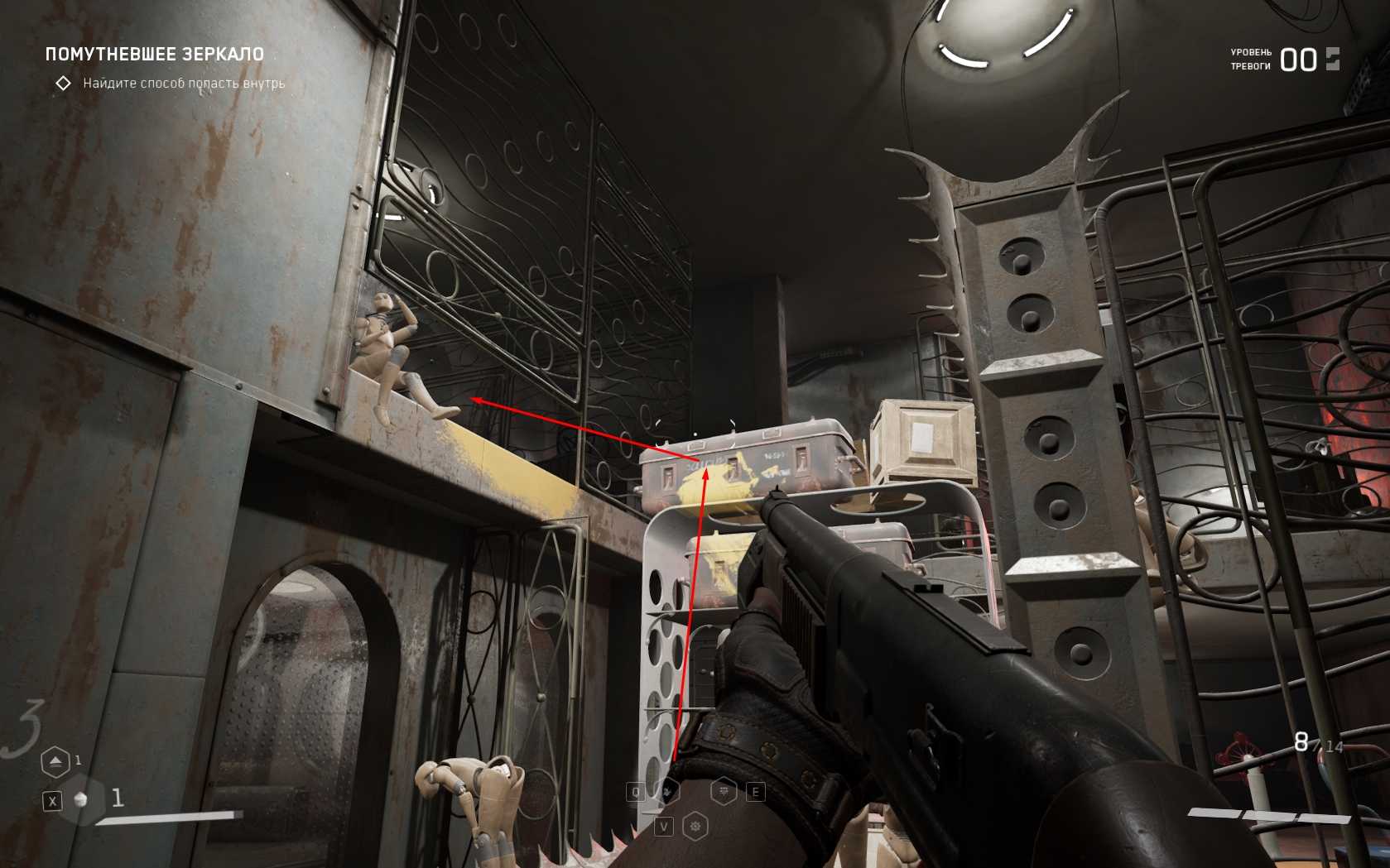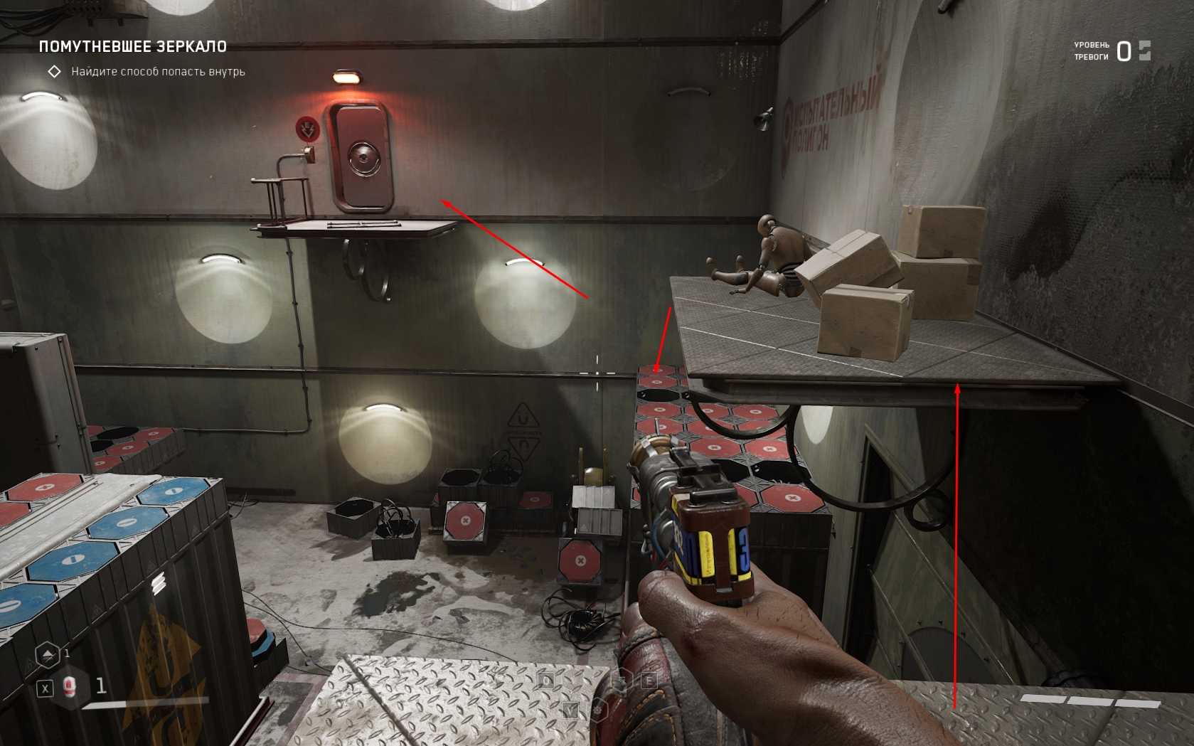 | 3 | Заберитесь слева на стеллаж с ящиками и залезьте наверх |  |