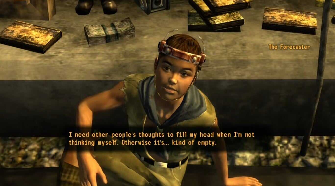 Впервые схожего героя мы встречаем в Fallout: New Vegas. NPC по имени Предсказатель сидит под мостом в районе торгового поста 188 и его легко упустить из вида, а в сюжетной линии он не упоминается. Предсказатель – маленький мальчик с необычным шлемом на голове. По его словам, он защищает от головных болей, а когда парень его снимет, то видит маму и папу, чтобы это ни значило (подробностей о его родителях в игре нет).