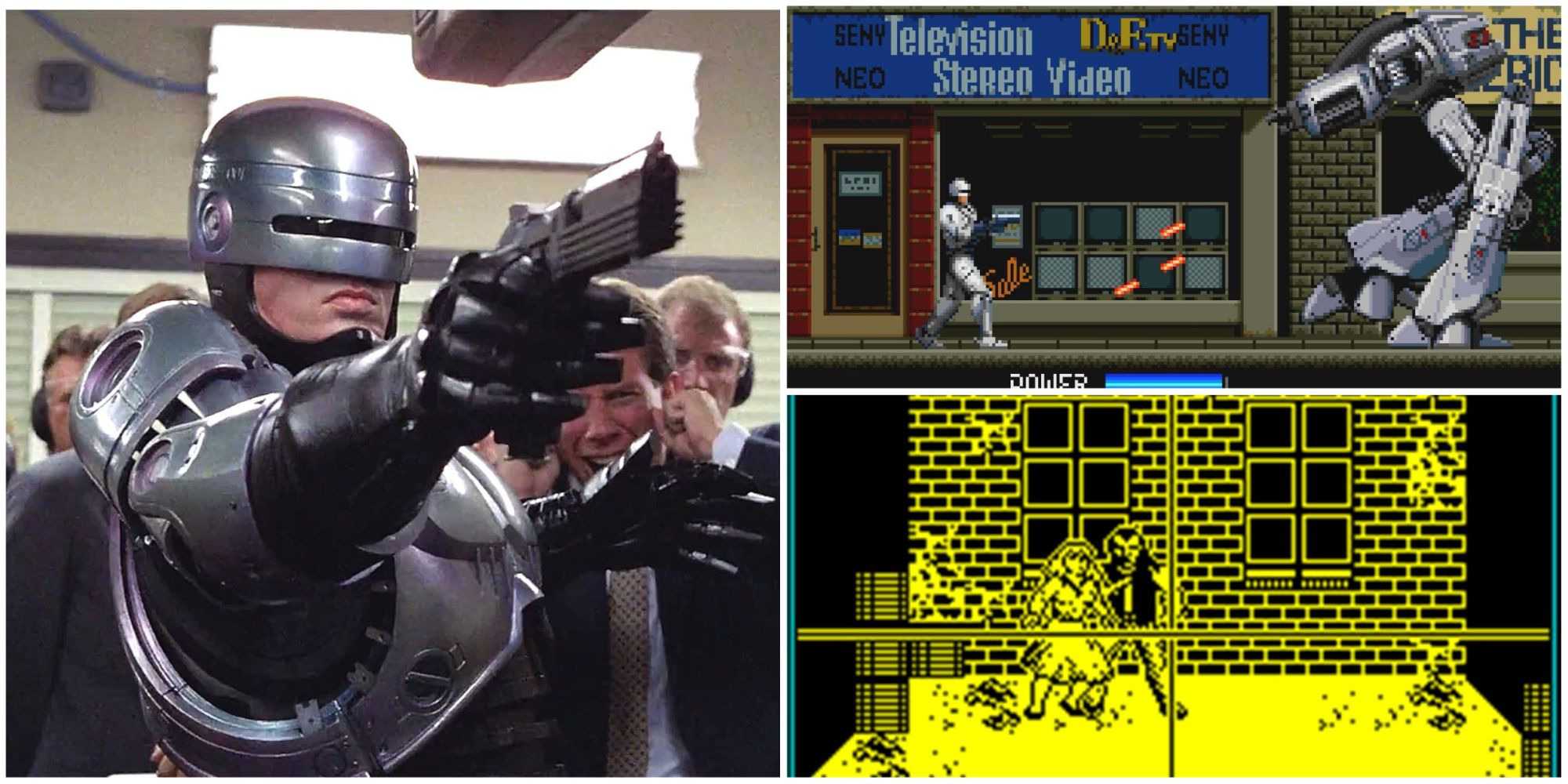 Ультранасильственная классика Пола Верхувена RoboCop получил несколько фантастических конверсий для видеоигр на игровых автоматах и домашних компьютерах. Трудно выбрать лучшую из них, так как, хотя по сути это одна и та же игра в стиле «беги и стреляй», каждая версия имеет тонкие различия. Аркада выделяется яркой красочной графикой, сэмплированной речью и звуковыми эффектами, использованными в фильме. Commodore Amiga имеет все это, но также содержит мини-игру identikit level, которая была показана в фильме, где Алекс Мерфи пытается опознать своих убийц. На ZX Spectrum есть все это, но также есть уровень от первого лица, где RoboCop должен застрелить преступника, который удерживает заложника. Все игры превосходны и заслуживают внимания поклонников фильма.