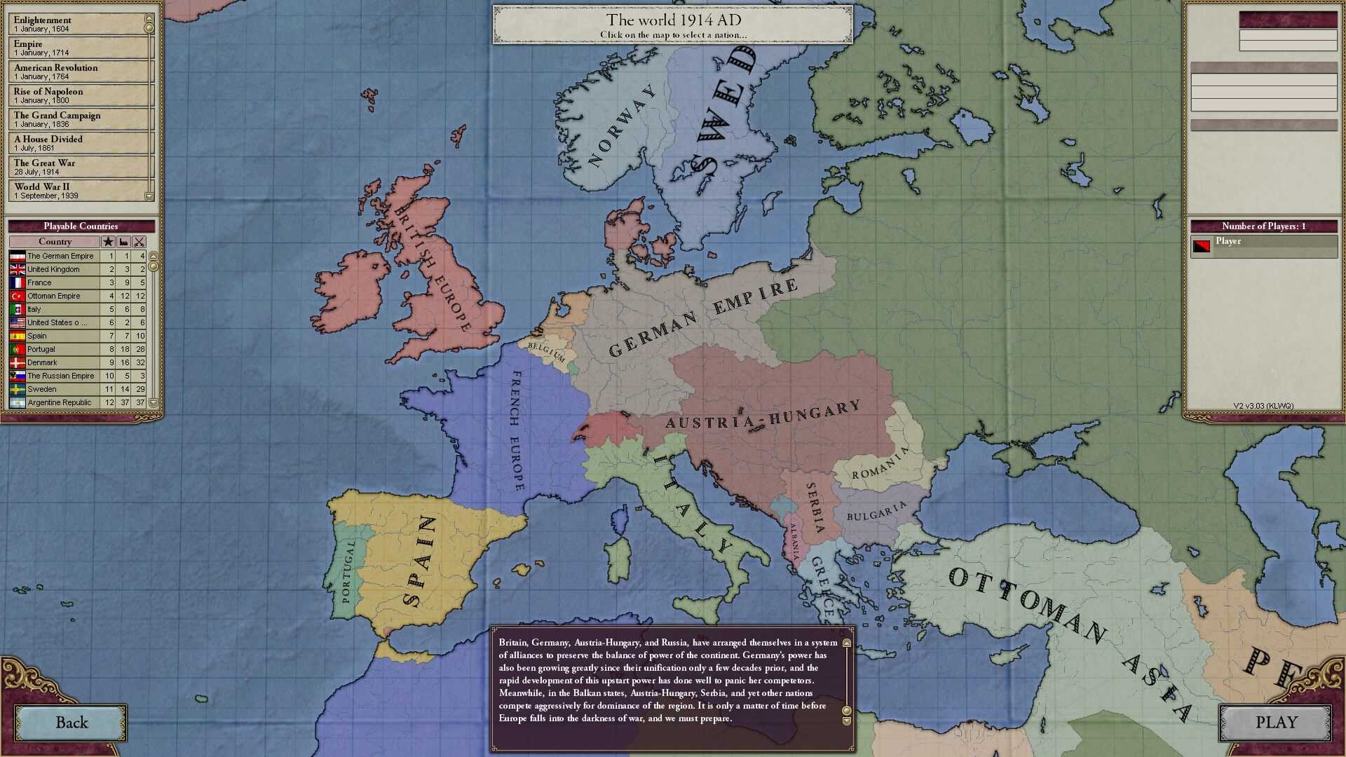Выберите свою любимую нацию Первой мировой и займите пост ее верховного главнокомандующего. Соблюдайте баланс между производством материалов, подготовкой войск и разработкой вооружения, учитывая запасы ресурсов на своей территории. Заключайте альянсы с конкурентами, проводите важные торговые сделки или побеждайте врагов в боях Первой мировой в выбранном вами сценарии. В тяжелые времена стране нужен ясно мыслящий лидер, такой, как вы. Берегите своих бойцов, учите их действовать на поле боя совместно и сражаться в рядах пехоты, в отрядах кавалерии или даже в первых экспериментальных танках. Развивайте свою страну и потихоньку завоевывайте весь мир.