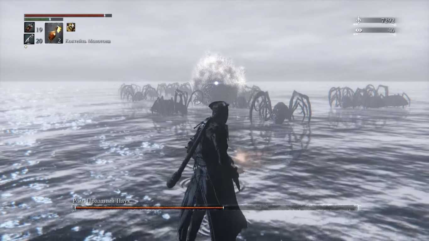в первый проем. Бегите вдоль стены, а затем поверните на мост. На мосту патрулирует «Поющий мозг». Лучше всего не вступать с ним в бой и просто обойди, в этом вам помогут многочисленные укрытия (запаситесь успокоительным). Пройдя мост, зайдите в здания. Там будет довольно темно (лучше взять факел), а ваши враги — пауки. Убив их пройдите через проход, а затем спуститесь в низ и потяните рычаг. В ролике вы увидите как Гигантский мозг (один из боссов) упал в пропасть, этим вы облегчили себе дальнейший путь.