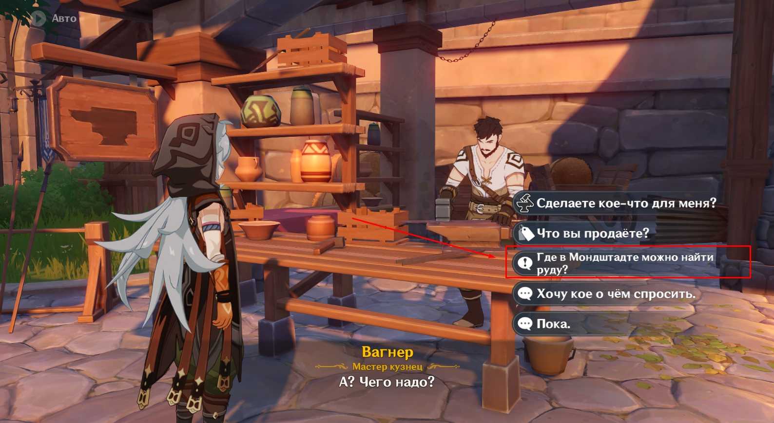 Чтобы отобразить на карте залежи Магической кристальной руды, поговорите с местным кузнецом и выберите отмеченную на изображении выше диалоговую строчку. После этого на карте появится несколько отметок в виде кристалла. Идите туда и увидите скопление руды. Причем, в указанном месте будет не только Магическая кристальная руда, но и немного другой, например, железо или обычные кристаллы.