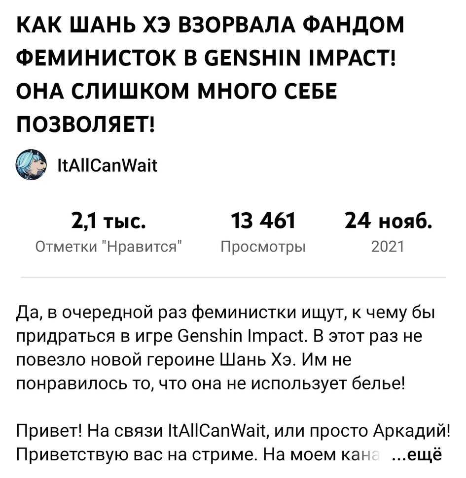 Тренд заметил видеоблогер Аркадий Прокошенков с ником на ютубе ItAllCanWait. В ролике с названием «Как Шань Хэ взорвала фандом феминисток в Genshin Impact! Она слишком много себе позволяет!» контентмейкер высмеял феминисток, которые, по его мнению, уделяют костюму героини слишком много внимания и преувеличивают проблему из-за собственной невозможности выглядеть сексуально.