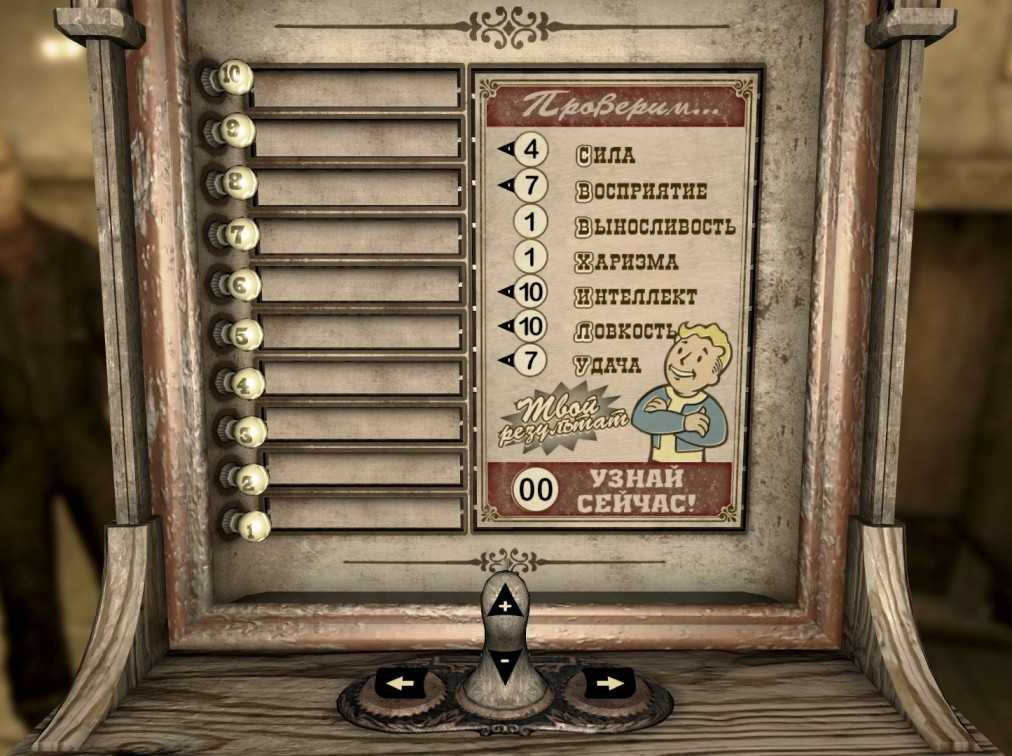 Ловкость – так как наш герой будет часто пользоваться режимом V.A.T.S., то значение этой характеристики мы также ставим на максимум, так как она влияет на количество очков действия в этом режиме. Кроме того, благодаря высокой Ловкости, наш персонаж будет быстрее перезаряжать оружие, и передвигаться.