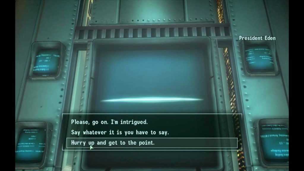Конечно, в лучших традициях серии, это оказывается подставой. На деле «президент» был расположенным на базе Анклава искусственным интеллектом, который создали, чтобы взывать к романтизированной идее американского процветания. В игре его великолепно озвучил Малкольм Макдауэлл, хотя, оглядываясь назад, выбор актера должен был подсказать игрокам, что здесь что-то не так. Но изначально разработчики хотели пойти еще дальше и пригласить на роль бывшего президента Билла Клинтона.
