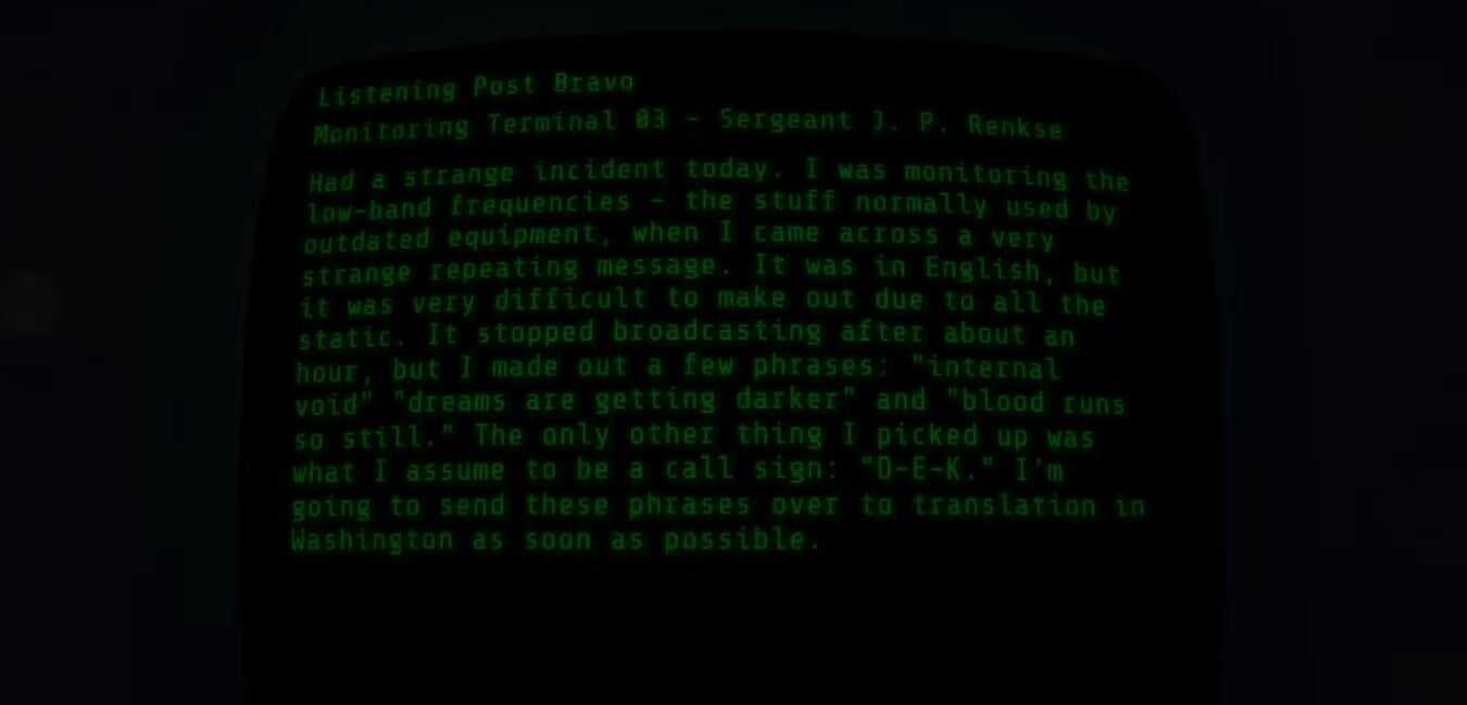 В пяти отчетах записана история одинокого радиста, который за несколько недель либо сошел с ума, либо его сгубило нечто паранормальное. Первая запись вполне адекватная – парень пишет, что заступил на пост, но перспектива просидеть одному за радио 4 недели его не радует. Далее он пишет о необычном послании: в неразборчивой передаче отчетливо слышны лишь фразы «внутренняя пустота», «сны становятся темнее» и «кровь застывает».
