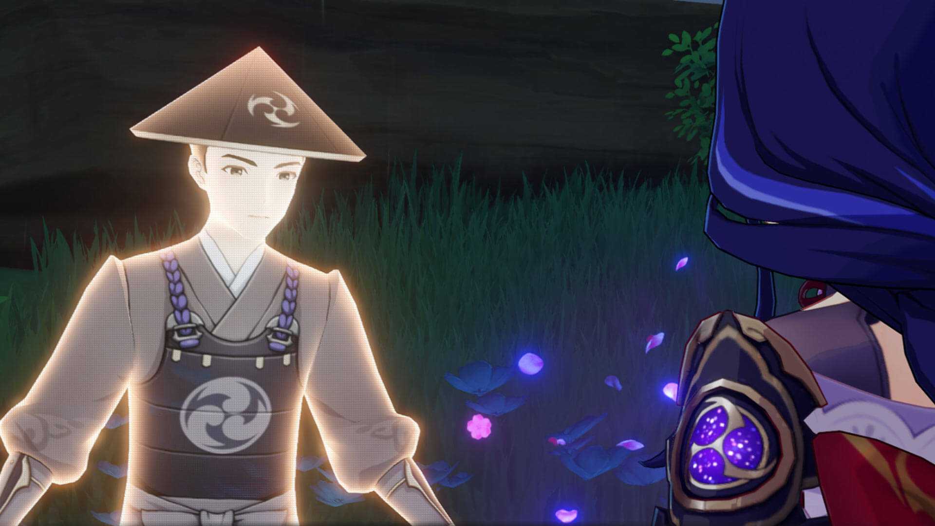 Осматриваем корни сакуры, из которых вытекает странная светящаяся жидкость, и появляется призрак. Эи пытается объяснить призраку, что война уже давно прошла, и Инадзуме больше ничего не грозит. Успокоившись, призрак исчезает. Эи объясняет, что мы видели воспоминания похороненного здесь самурая. Священная сакура может поглощать и очищать загрязнения в артериях земли. После нападения гончих часть этих загрязнений просочилась через трещины в стволе и образовала физическую сущность — призрака солдата, который сражался тут 500 лет назад.