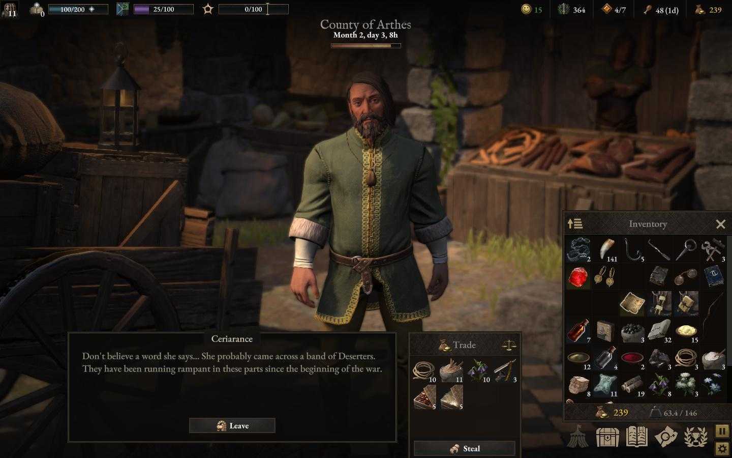Если снова сравнить игру с Battle Brothers, то менеджмент ресурсов тут выглядит немного сложнее и является главной “угрозой” – это я говорю с позиции игры на стандартной сложности. Да, в Wartales враги не так страшны, как постоянная нехватка еды, медикаментов и инструментов для починки брони. Всякий раз, отправляясь в неизведанные места карты, где может не быть города поблизости, необходимо рассчитать еду так, чтобы её хватило на путь туда или обратно. Иначе люди начнут уходить, милорд. А без медикаментов они вовсе откажутся сражаться.