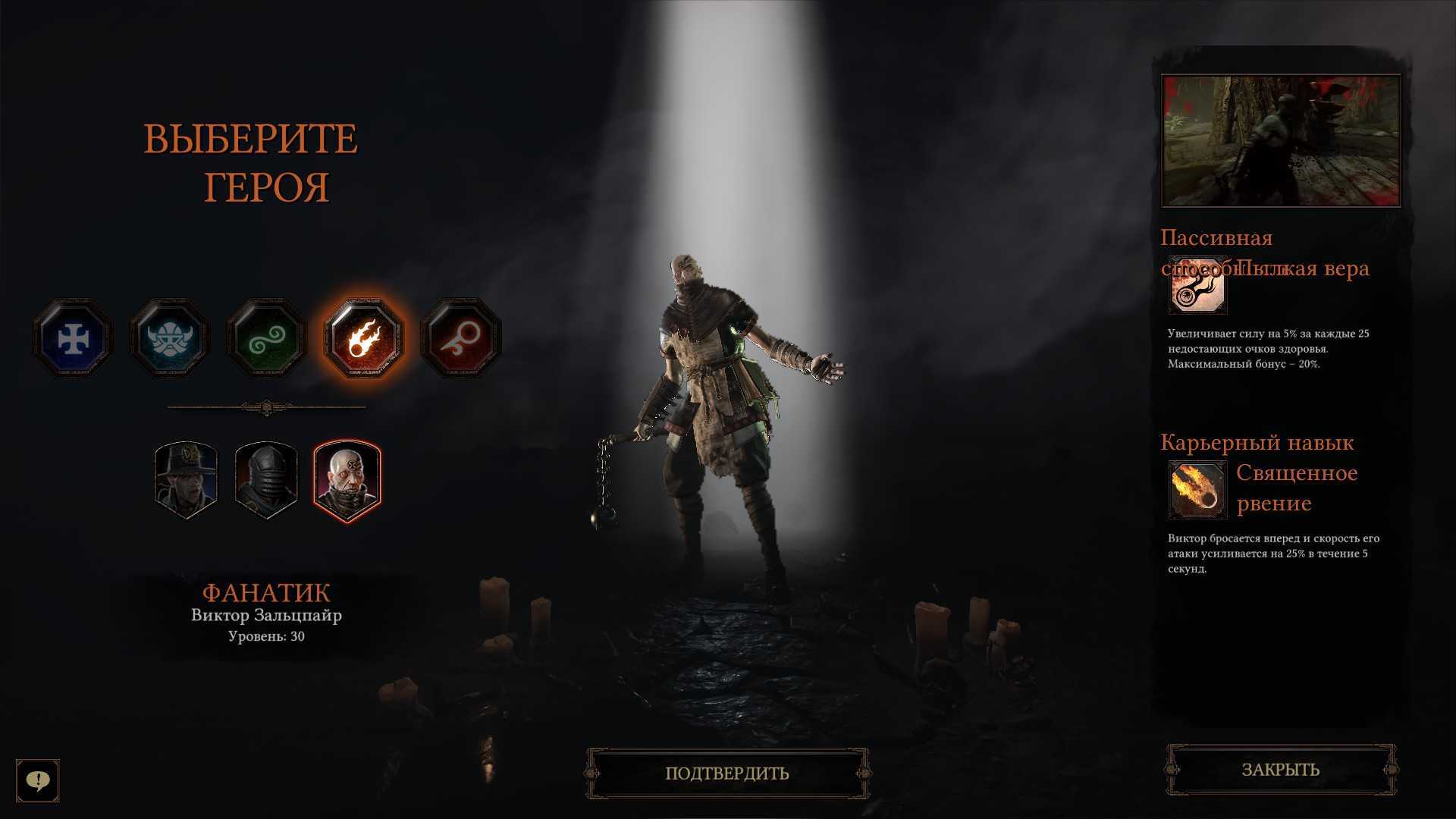Фанатик – третий класс инквизитора. Задумка у класса понятна – чем меньше хп, тем больше кпд персонажа. Только вот охотник за головами прекрасно справляется с такими же задачами и без потери внушительной части здоровья. Откровенно считаю идею хорошей, но фактически получилось не так здорово, как оно выглядит на бумажке. Играбельный, но предыдущие два класса всё таки могут зайти для команды лучше.