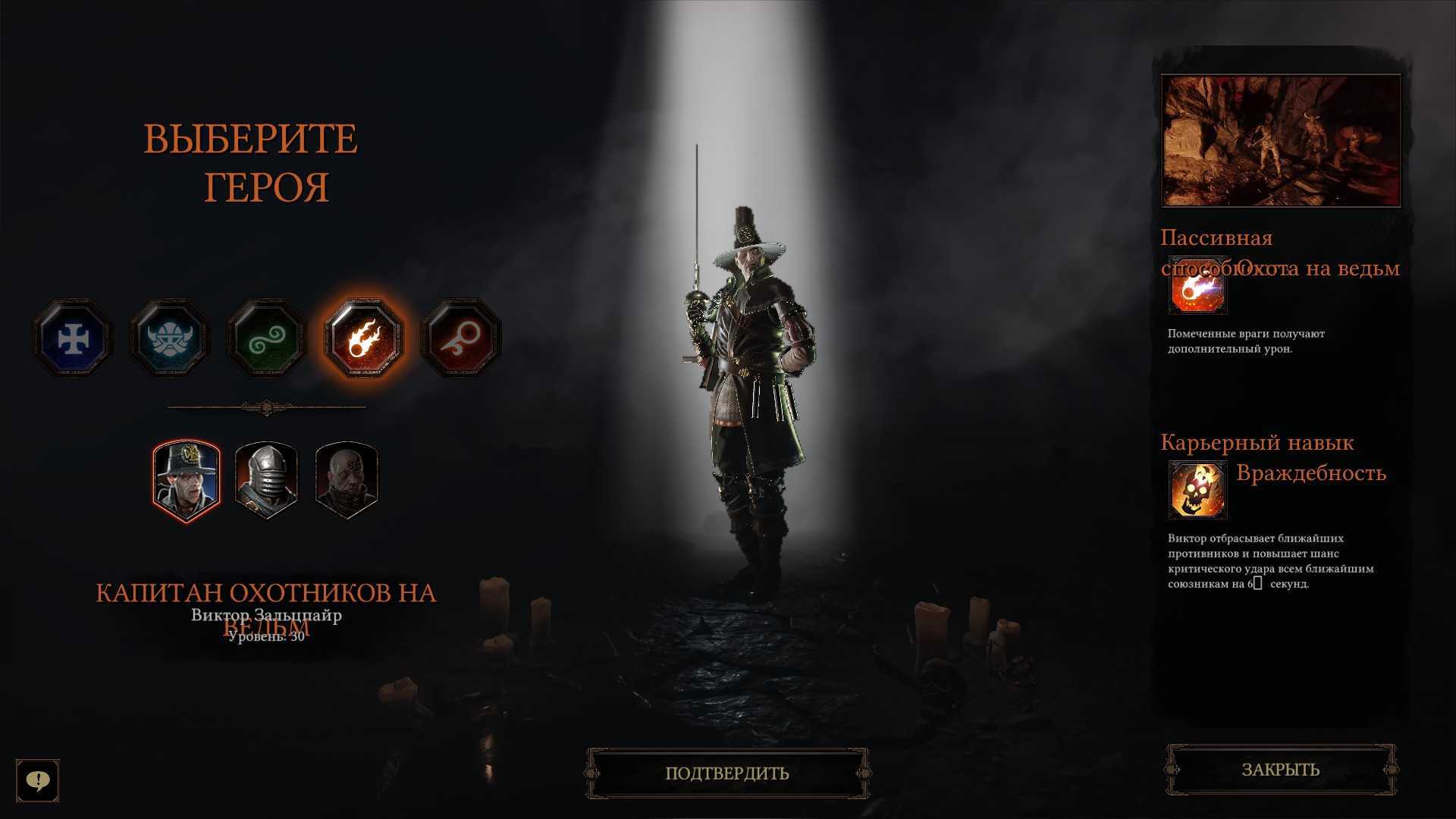 Но не об этом сейчас. Первый класс – капитан охотников на ведьм. Вполне играбельный класс, имеет неплохой урон и выживаемость в игре. Каких-то интересных фишек рассказать про него не могу, разве что реген всей группы на 2hp, когда умирает помеченный враг. Прикольная штука, но это если ваша команда не брезгует нажимать букву T хотя бы изредка. В целом универсальный класс, имеет приемлемые показатели атаки и живучести, объективных причин не любить его нет. Играбельный класс.