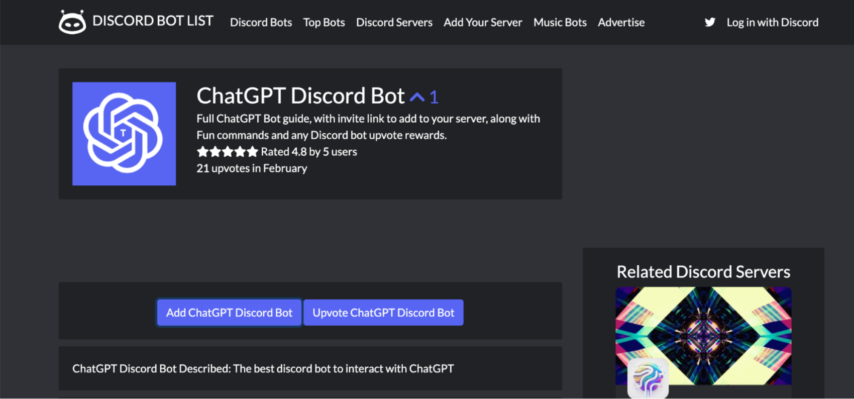 После этого идём на сайт ботов для Дискорда и находим там бота ChatGPT. Нажимаем на кнопку Add ChatGPT Discord Bot, чтобы добавить к себе этого бота:
