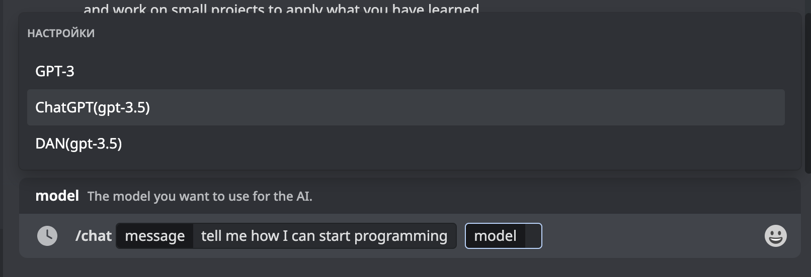 Чтобы отправить запрос, пишем /chat — бот сразу предлагает написать сообщение и выбрать языковую модель. Обычная языковая модель ChatGPT даёт нежные и приятные результаты, модель DAN даёт грубые и неполиткорректные ответы.