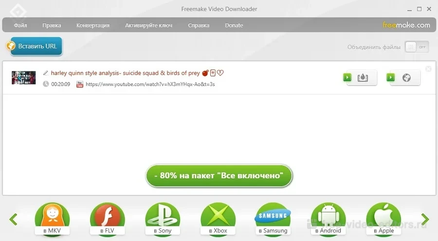 Софт также предлагает функцию оптимизации видеофайлов под популярные переносные устройства, в том числе смартфоны и планшеты Android и iOS. Программа отличается высокой скоростью загрузки и конвертации и не накладывает лимитов в бесплатной версии. Единственным ограничением в free-лицензии является логотип на загруженной файле.