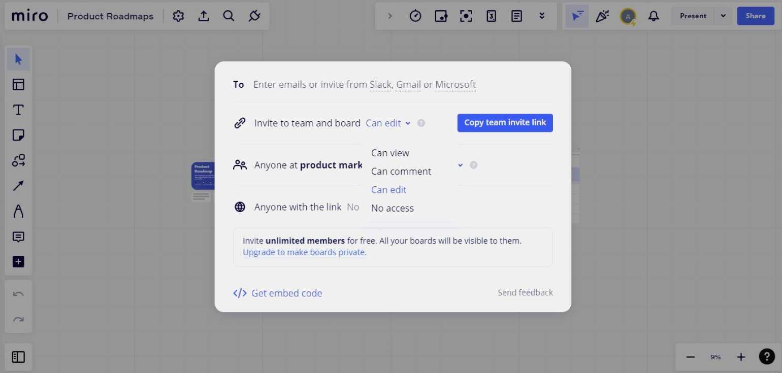 Так выглядят настройки — можно разрешить комментирование или редактирование доскиСкриншот: Miro / Skillbox Media
