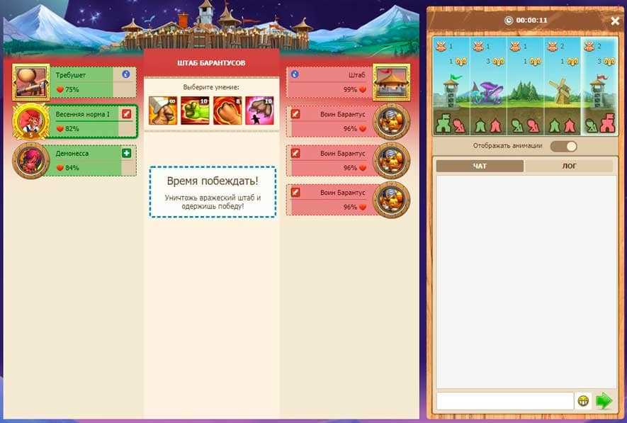 Тут же в битву можно взять воина с различными умениями, большинство которых открывается по мере взятия уровня, среди которых такие как: зверь, лекарь, танк, ниндзя, инженер. Здесь же изучаются мощные скилы при помощи, которых можно эффектно и изящно пободатся, где большинство это разнообразные удары. В целом однокнопочное занятие с перетаскиванием необходимых вещей и отдачей команд.