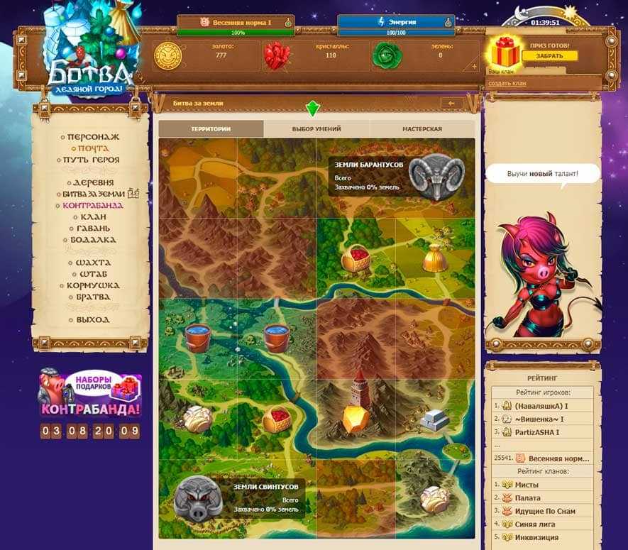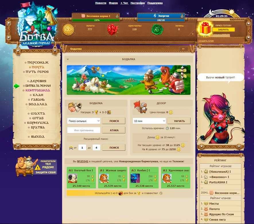 Хотя функционала и контента очень много, а от увиденных впервые окошек и менюшек будут разбегаться глаза, нельзя считать интерфейс навороченным, а управление сложным. Тем более перед вашими похождениями будет обучение, где вам расскажут, как вырастить боевого кабана или барана. Информации буквально валом и ничего лишнего, постепенно шаг за шагом вы в онлайн игре Ботва, станете как рыба в воде. Слева расположены главные вкладки меню со всеми локациями и местами завязанными на игре. Справа информеры и рейтинговые таблицы, а вверху игровые ресурсы и индикаторы состояния вашего персонажа. Причём есть возможность оценить игру в демо-режиме без регистрации.