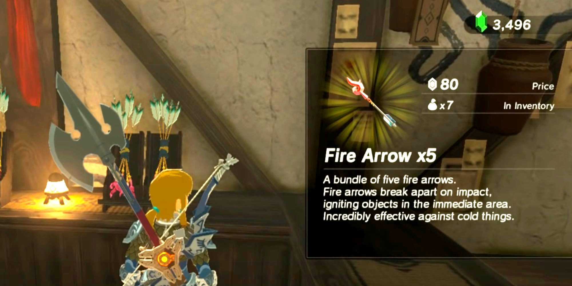 Как и обычные стрелы, огненные стрелы — это награда, которую можно получить из сундуков. Если вам нужно много огненных стрел, то вам нужно купить их в магазине. Лучше всего покупать огненные стрелы в магазине «Любопытный колчан» в деревне Какарико, в специализированном магазине стрел в городе Герудо и в магазине «Горон Густо» в Горон-Сити.