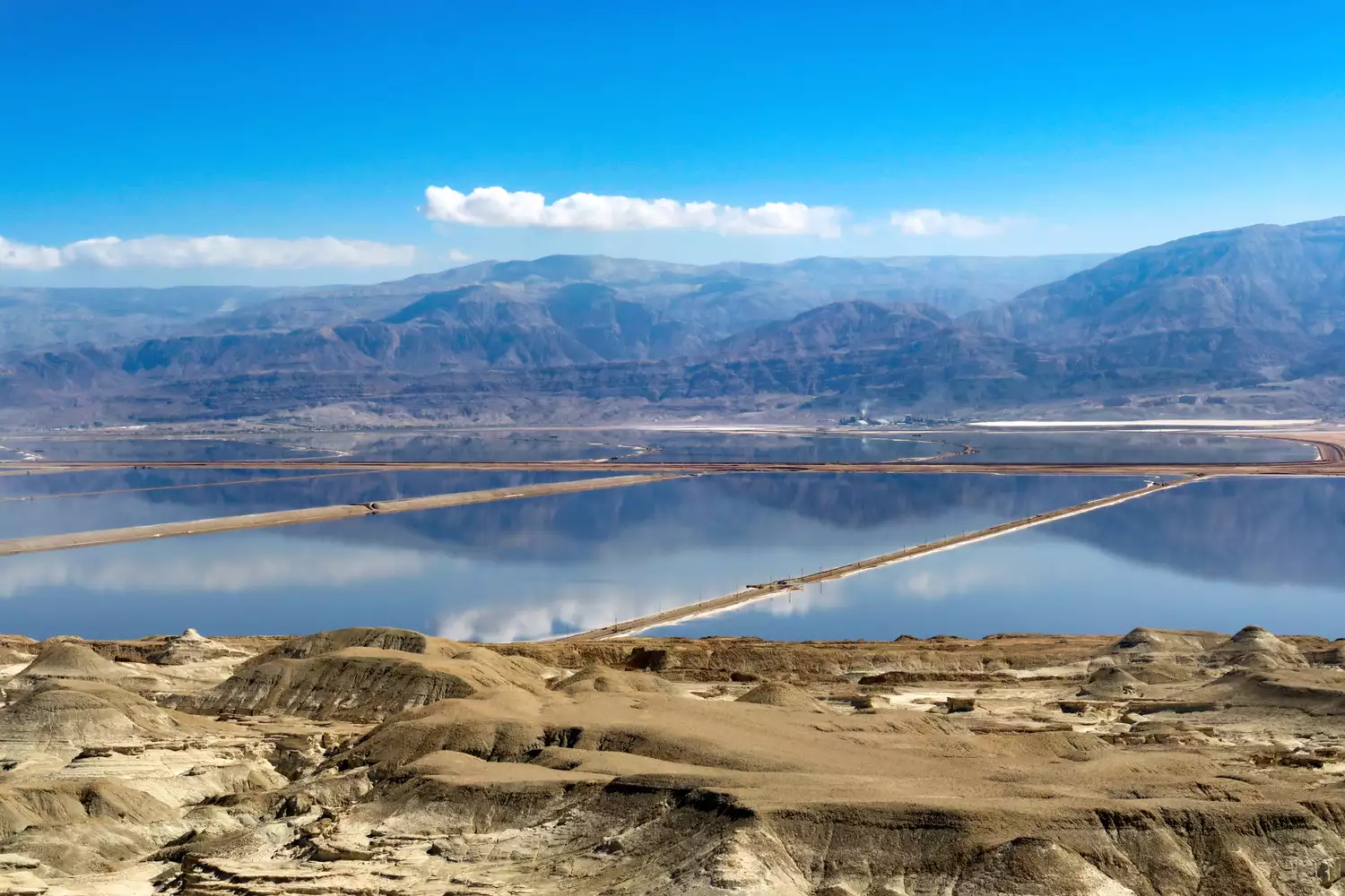 Lake Lisan also left behind what’s now known as the Lisan Peninsula—a large salty uplift that created an incomplete divide in the Dead Sea. Due to drops in the Dead Sea’s water level, the Lisan Peninsula now blocks the southern portion of the Dead Sea completely. This southern basin is now made of artificial evaporation ponds for commercial salt production.