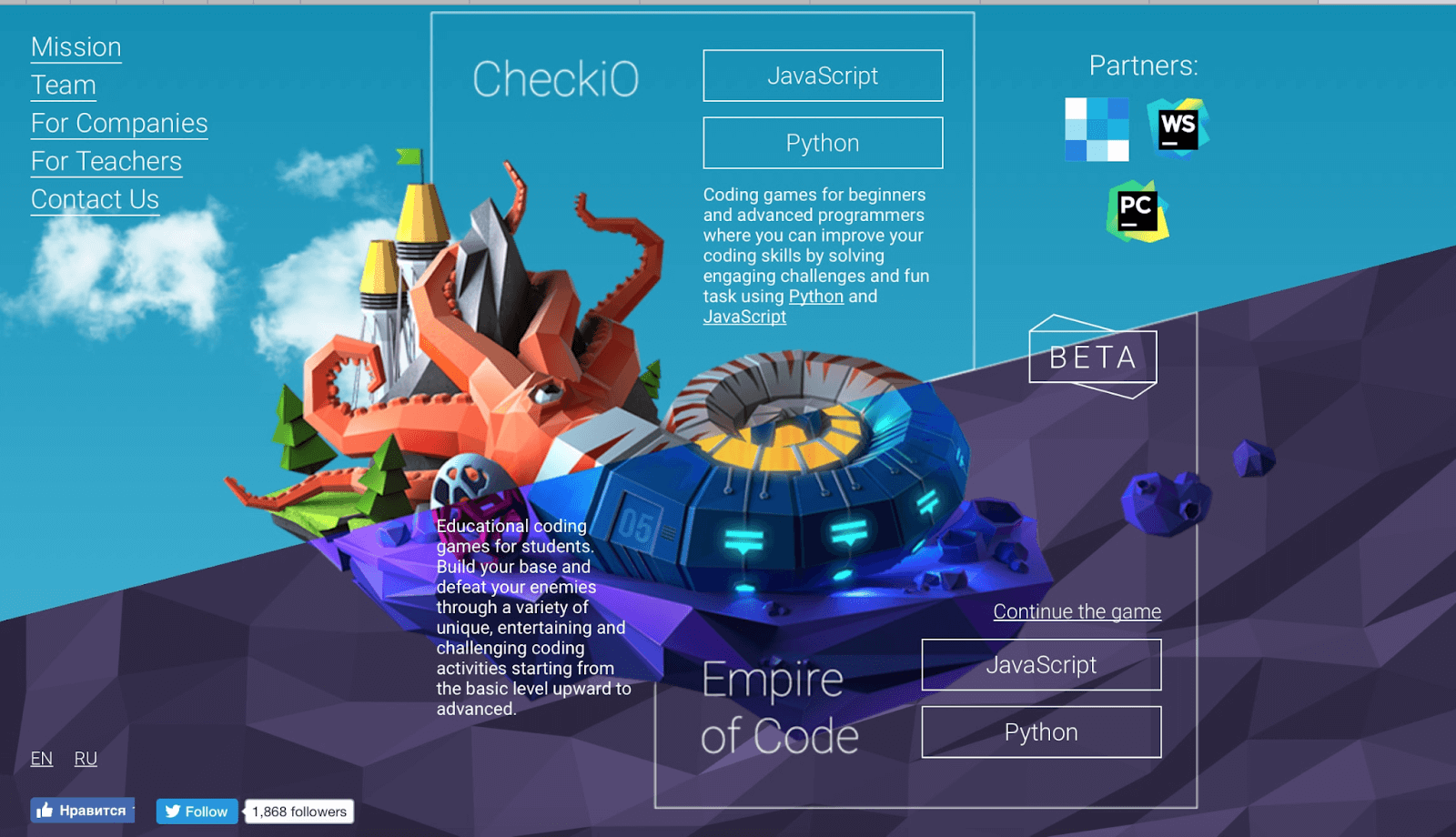 Известная браузерная игра для изучения программирования, поддерживает языки Python и JavaScript.