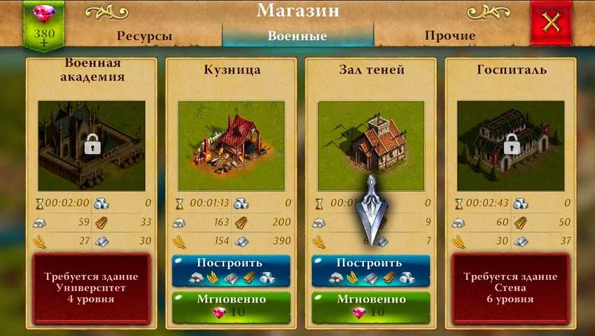 Еще один важный момент в развитии вашей экономики — это изучение наук в здании университета! Их четыре: война, экономика, герой, крафт. Наука «Война» — позволяет улучшать и нанимать разный вид войск, её мы и начнем изучать в самом начале прокачавшись до найма «Стражей». Стражи — второй вид пехоты и пожалуй самый лучший вид войск, для сбора ресурсов, конечно «ополченцы» тоже не плохи в самом начале, но уступают по многим показателям.После того, как прокачали стражей, переходим к изучению науки «Герой». Там мы изучаем — «Превосходство над Монстром 1 уровня» Что позволяет нашему герою атаковать монстров-големов 1ур, получая за них опыт, ценные трофеи и ресурсы. И этого знания для прокачки героя на первое время нам хватит