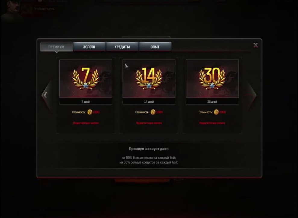 Есть и магазин, где можно купить премиум аккаунт (на 50% больше опыта и кредитов за каждый бой) максимум на 30 дней, золото (пока недоступно), обменять золотые токены на кредиты (1 на 400) или купить свободный опыт (1 на 25).