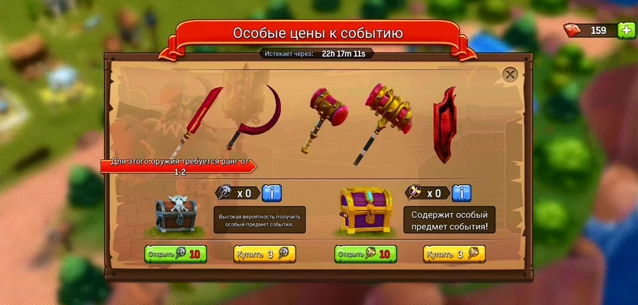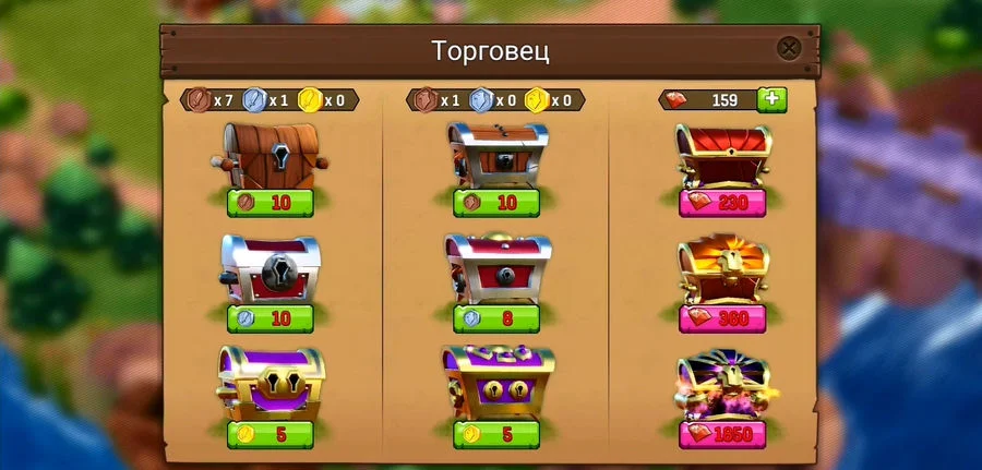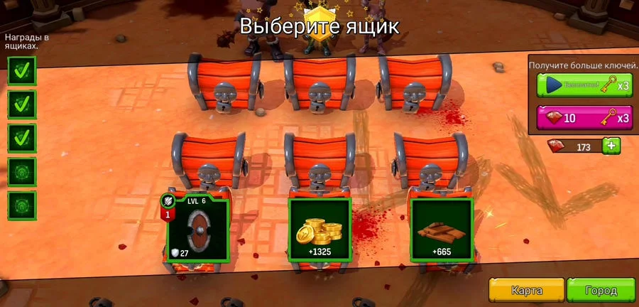 Открытие сундуков. После выигрышного матча вам выпадают 9 сундуков с призами. Три из них вы открываете бесплатно, еще три — за просмотр рекламы, и последние — при наличии VIP-статуса или за самоцветы. Качество наград в сундуках отображается при помощи карточек (показаны в левой части экрана). Золотые и красные карточки говорят о высоком качестве наград.
