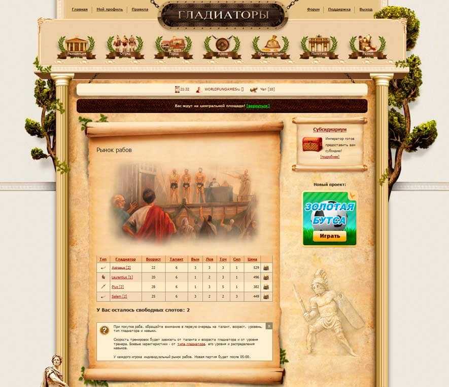 Первым делом в браузерном файтинге игры Гладиаторы вас обучат и введут в курс дела проведения боёв в Римской Империи, далее будет череда обучающих квестов и игровых советов с рекомендациями. В ходе, которых вы разберётесь в интерфейсе, сможете нанимать бойцов, экипировать их и строить необходимые здания на территории своего поместья. Всё довольно подробно разъясняется и на это уходит немного времени, хотя многие жалуются, что, мол, слишком сложно.