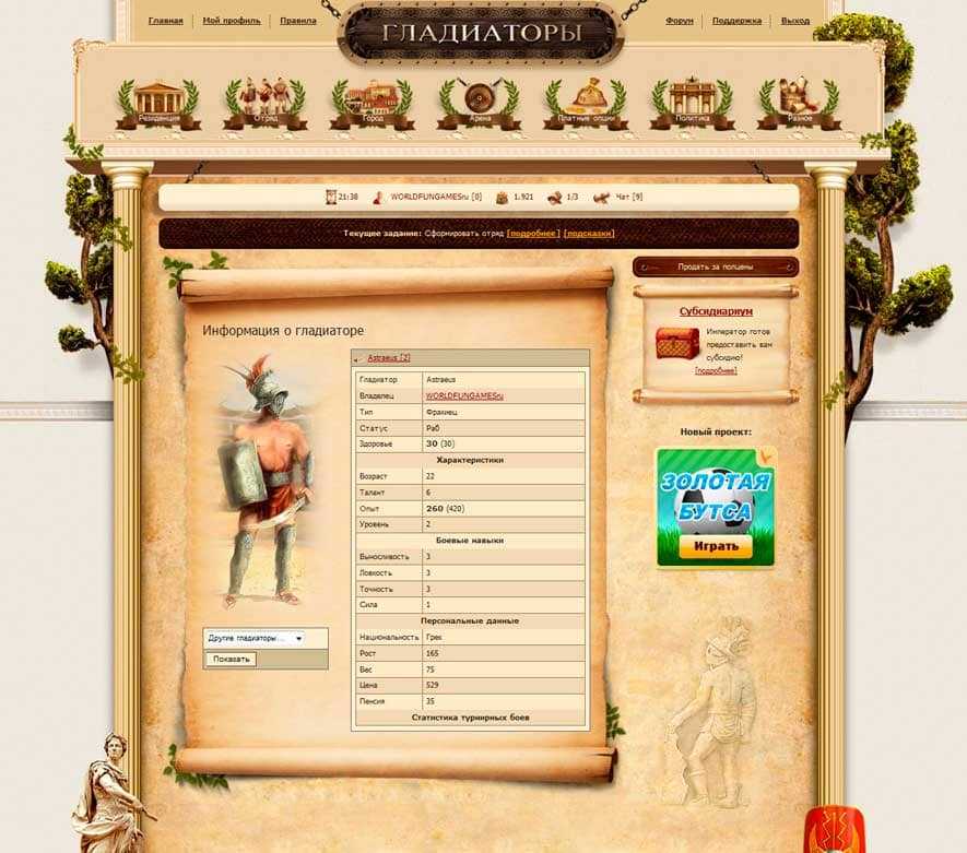 Вся ваша деятельность будет в четырёх направлениях: строительство производственных зданий для стабильного дохода, наем и обучение бойцов, участие в боях на аренах. И вишенка на торте это политическая деятельность, которая определяет некоторые аспекты боёв на аренах в кубках и чемпионатах. Для этого нужно получить место в сенате, для этого нужен только Vip аккаунт. Более подробно об игре читайте ниже в обзоре.