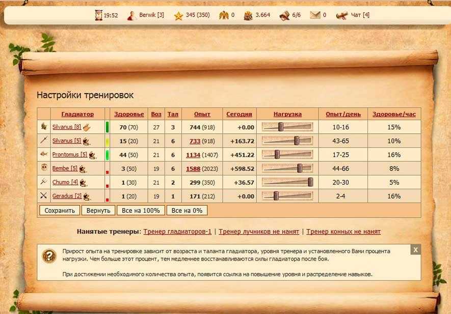 Талант – благодаря этому параметру гладиатор получает больше опыта за меньший промежуток времени и быстрее прокачивается.