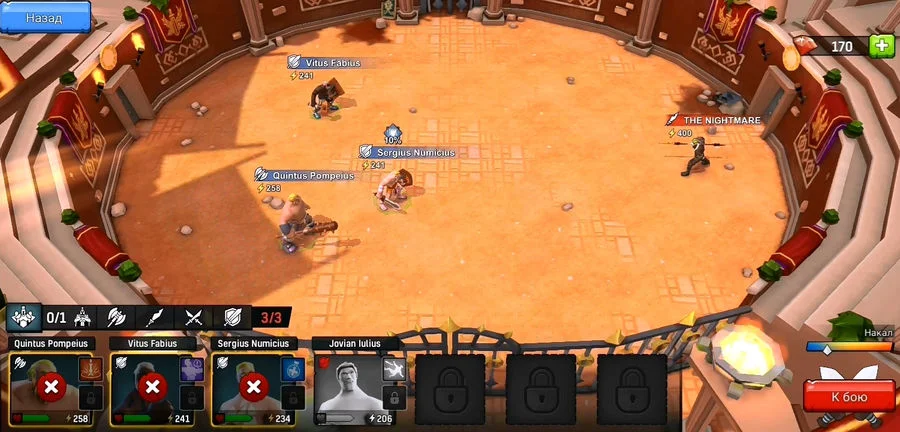 Расстановка бойцов. Попав на арену активности, вам необходимо правильно расставить своих гладиаторов. Не забывайте изучать соперников — для этого кликните по врагам и ознакомьтесь с их статистикой и применяемой экипировкой. Далее подберите команду бойцов, соответствующую заданным условиям.