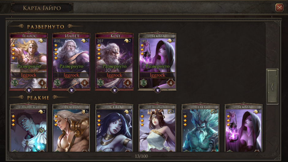 Чтобы захватывать участки, нам нужны боевые гайро, как здесь называются карты с образами различных богов (библейских и греческих, а также просто мифических существ. То есть здесь всякие Прометеи, Кроносы и Океаны соседствуют с Япетами и Коями, ). Их можно вызывать в специальной вкладке за игровые монеты и гемы (донат ресурс).