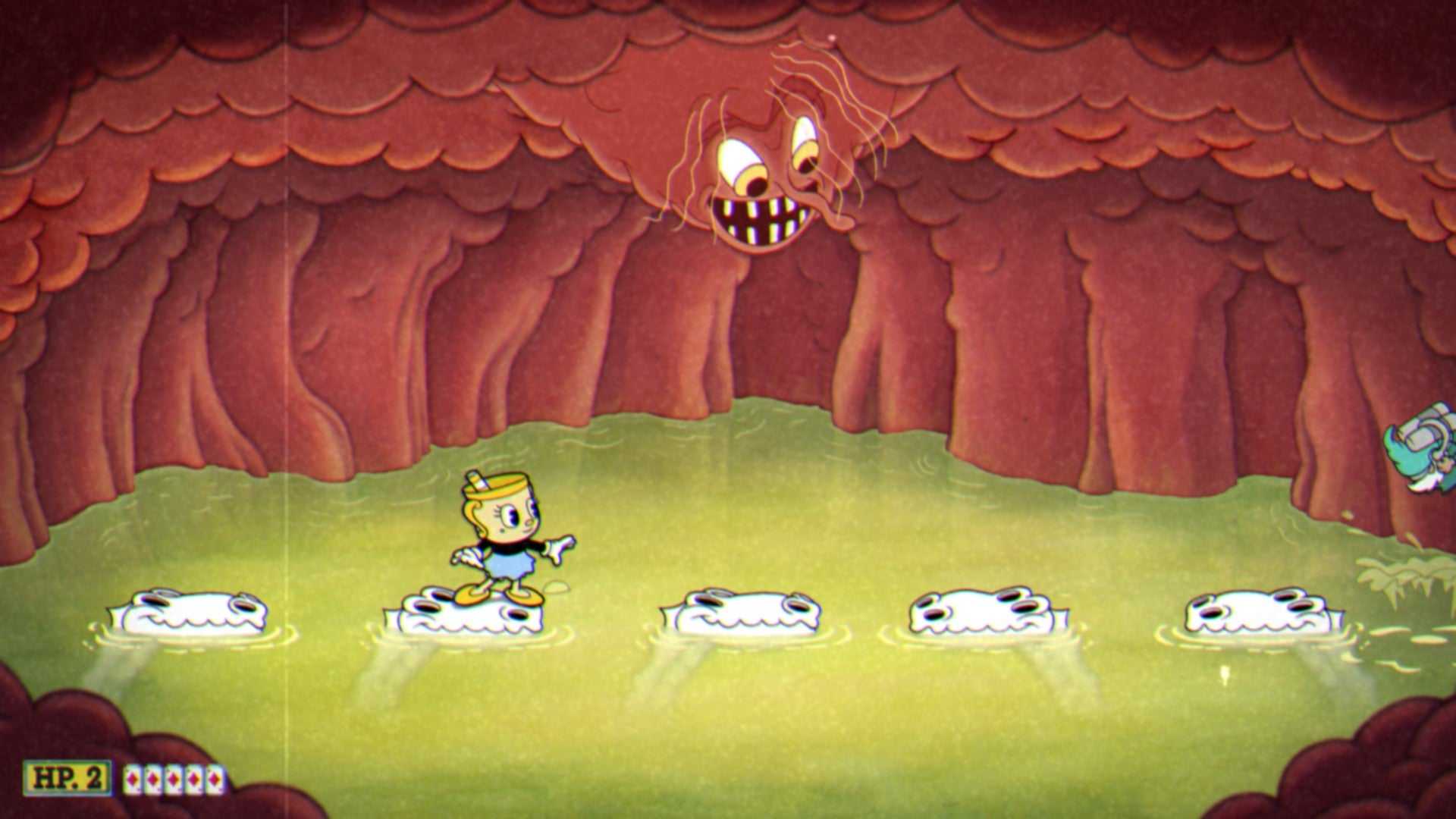Как только платформа съест снаряд, она исчезнет, оставив вам меньше места для использования. Когда их останется совсем немного, один из черепов откроет рот и зазвонит в колокольчик – вам нужно парировать его, чтобы все платформы вернулись обратно.