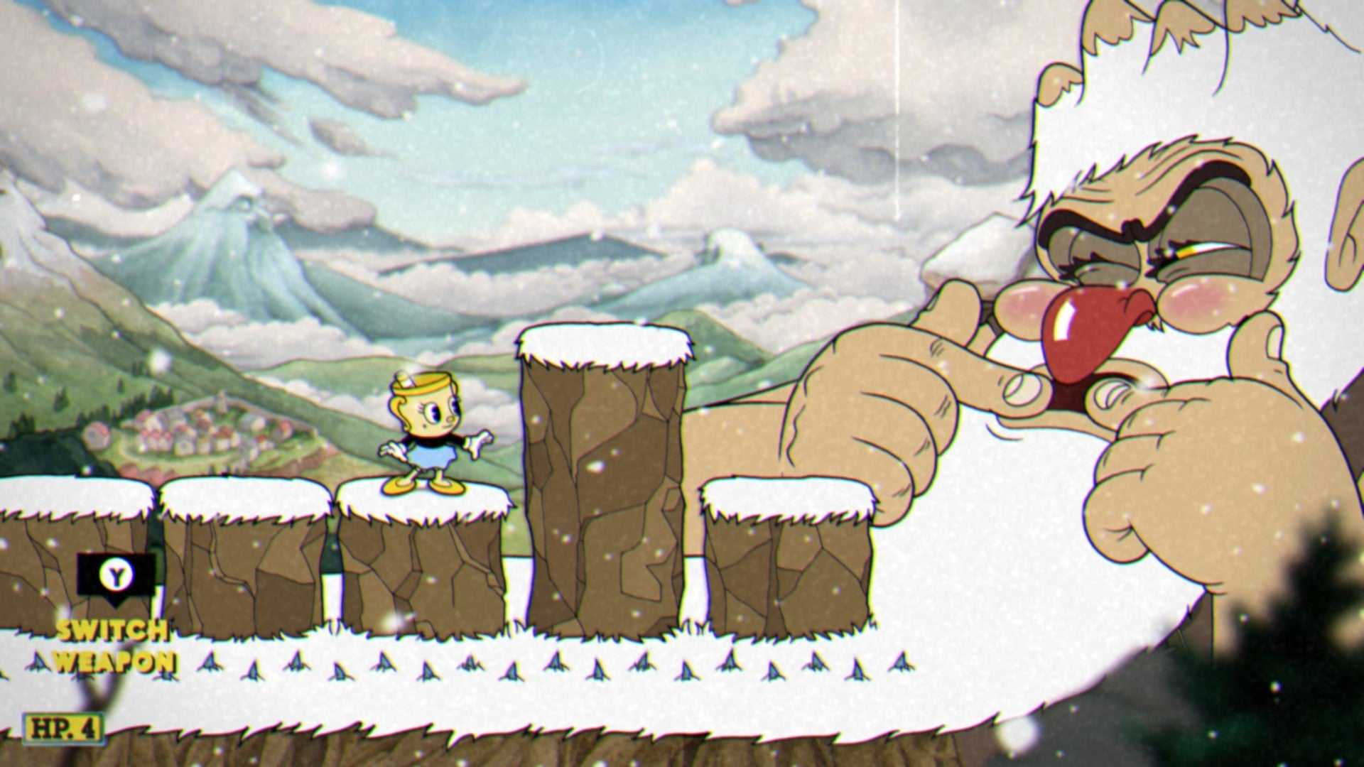 - Помимо своих маленьких миньонов, у великана Глумстоуна будет три собственных специальных приема. Один из них заключается в том, что он открывает рот и показывает гномов, варящих зелье в котле. Они будут бросать в вас опасные облака, а также розовое облако, которое вы сможете парировать.