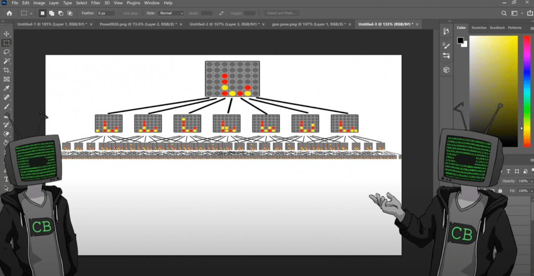На всём поле создаются рандомные типы фишек. Когда процесс создания закончен, запускается процесс поиска комбинаций, который будет описан в последующих статьях на сайте. Процесс поиска комбинаций, определяет все комбинации на поле, после чего уничтожает их, не засчитывая ни какому из игроков бонусы от этой комбинации. Следующим запускается процесс, движения фишек вниз. Как понятно из названия, он сдвигает все фишки вниз, для того, чтобы не образовывались пустые места, на месте удалённых комбинаций. После чего процесс запускается по новой: создание фишек, поиск комбинаций, движение вниз. Всё это продолжается до тех пор, пока на поле не окажется ни единой комбинации. Именно в этот момент мы и запускаем бота, который должен обнаружить все возможные комбинации и сделать наиболее сильный ход.