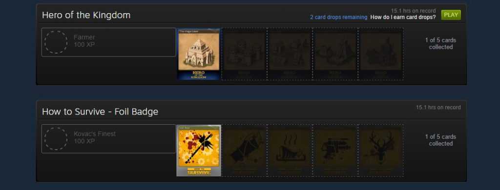 Если игра платная, то Вам выпадет примерно половина от её полной коллекции. На примере ниже в игре Energy Balance мне выпало 3 карточки из 5 (посмотреть можно в разделе «Значки»).