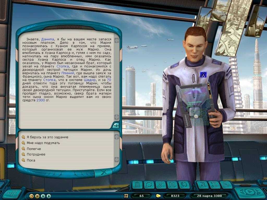 Помимо торговли мы можем набрать заданий на планетах. Будут и обычные курьерские доставки, и охота за головами, и конвоирование важных персон. Хардкорностью выделяется только охрана системы. За определенный промежуток времени вы должны не допустить ни одной смерти в системе. На 100% сложности сделать это не так трудно, но начиная с 200% наступает настоящий челлендж.