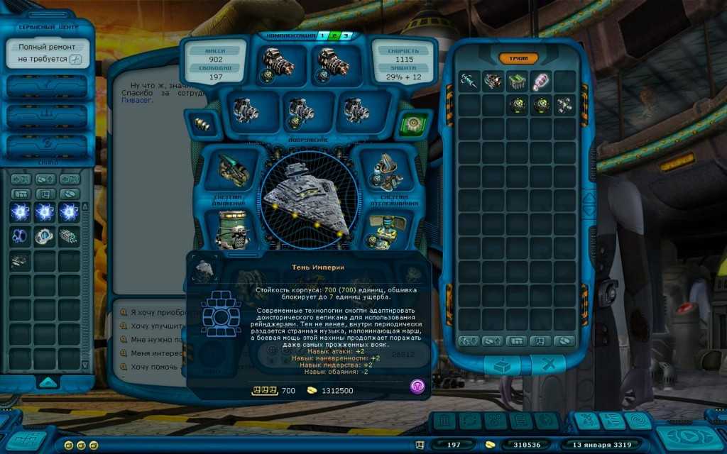 В большом холодном космосе лучший друг рейнджера – его корабль. Всего для корабля есть семь видов оборудования разного качества. От одного до пяти слотов под оружие. Имеются отдельные ячейки под артефакты, которые могут оказывать и положительное, и отрицательное влияние на корабль. И ко всему этому приложим микромодули, улучшающие отдельные типы оборудования. Есть интересная механика массы у обвесов. Каждый корабль имеет свою вместимость и мы не сможем загрузить его оборудованием сверх этого значения. Если же не забивать судно до отказа, то оставшееся свободное место будет использоваться как трюм. Так что да, хотите торговать – ищите корабль повместительнее.