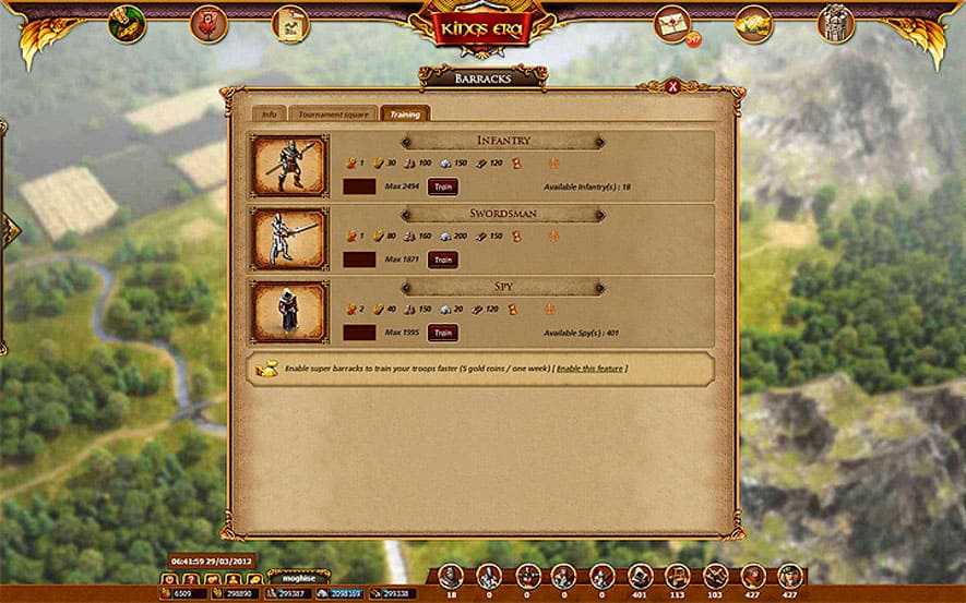 Для новобранцев в браузерной игре Kings Era действует защита от нападения других игроков, так что не беспокойтесь, сходу вас никто не снесёт, но нужно не быть сонной мухой и держать ухо в остро, но все ваши враги на первых уровнях будут ботами (AI). Если же вы уже играли в подобные игры, то легко справитесь, и помощник всегда поможет своим советом. Игровая механика являются классической: строите город, добываете ресурсы, развиваете армию, расширяете границы, основываете новые города и создаёте героя, в игре существует смена дня и ночи. Квесты так встроены в игру, что игнорировать их нельзя, ведь награды за их выполнения не только ресурсные, но также игрок может быть обрадован золотом.
