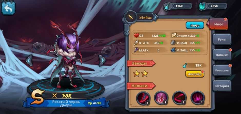 Также героев нужно прокачивать, повышая им уровень (каждые 5-15 уровней при этом нам нужно использовать гемы для развития) и одевая руны. Руны выполняют роль шмота, их можно менять, улучшать, они дают различные бонусы к характеристикам.