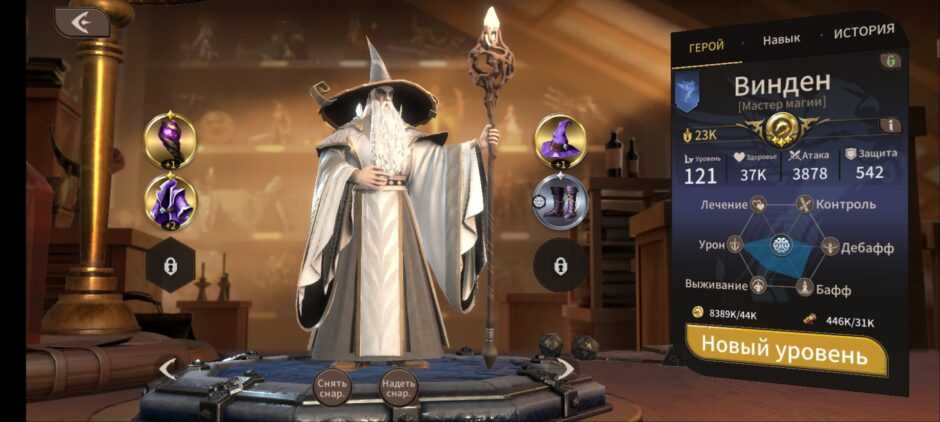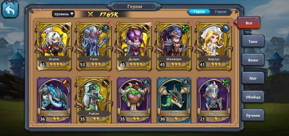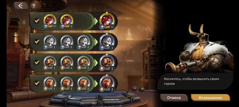 банально до боли и зубовного скрежета. Получив героя, мы получаем его базовую версию, но если выпадает дубль, то базового можно возвысить, объединив двух одинаковых героев. Чем больше объединений, тем круче наш юнит и тем больше уровень ему можно сделать. Также героям нужно повышать уровень за свитки опыта, после определенного уровня нужны еще сферы. НЕ забываем и про снаряжение — без мержа, просто одел шмотку, поточил по возможности, играешь,