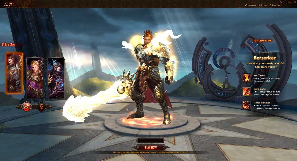 - Воин — могущественный и медлительный «танк», способный выдержать фактически любой урон, соответствующий уровню персонажа. В онлайн игре Light of Darkness он легко уничтожает группы врагов и применяет сокрушительную магию огня.