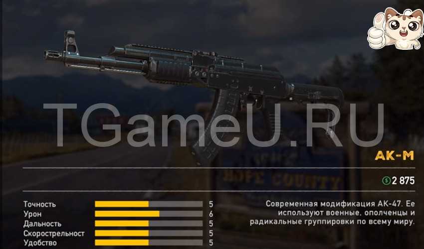 Наиболее же оптимальной, на наш взгляд, винтовкой является «AK-M«. Найти и использовать «калаш» по началу не удастся. Но далее, мы советуем делать выбор, имеено в сторону «AK-M«. Хороший урон и кучность стрельбы н средних и дальних дистанциях делают это оружие в Far Cry 5 незаменимым.