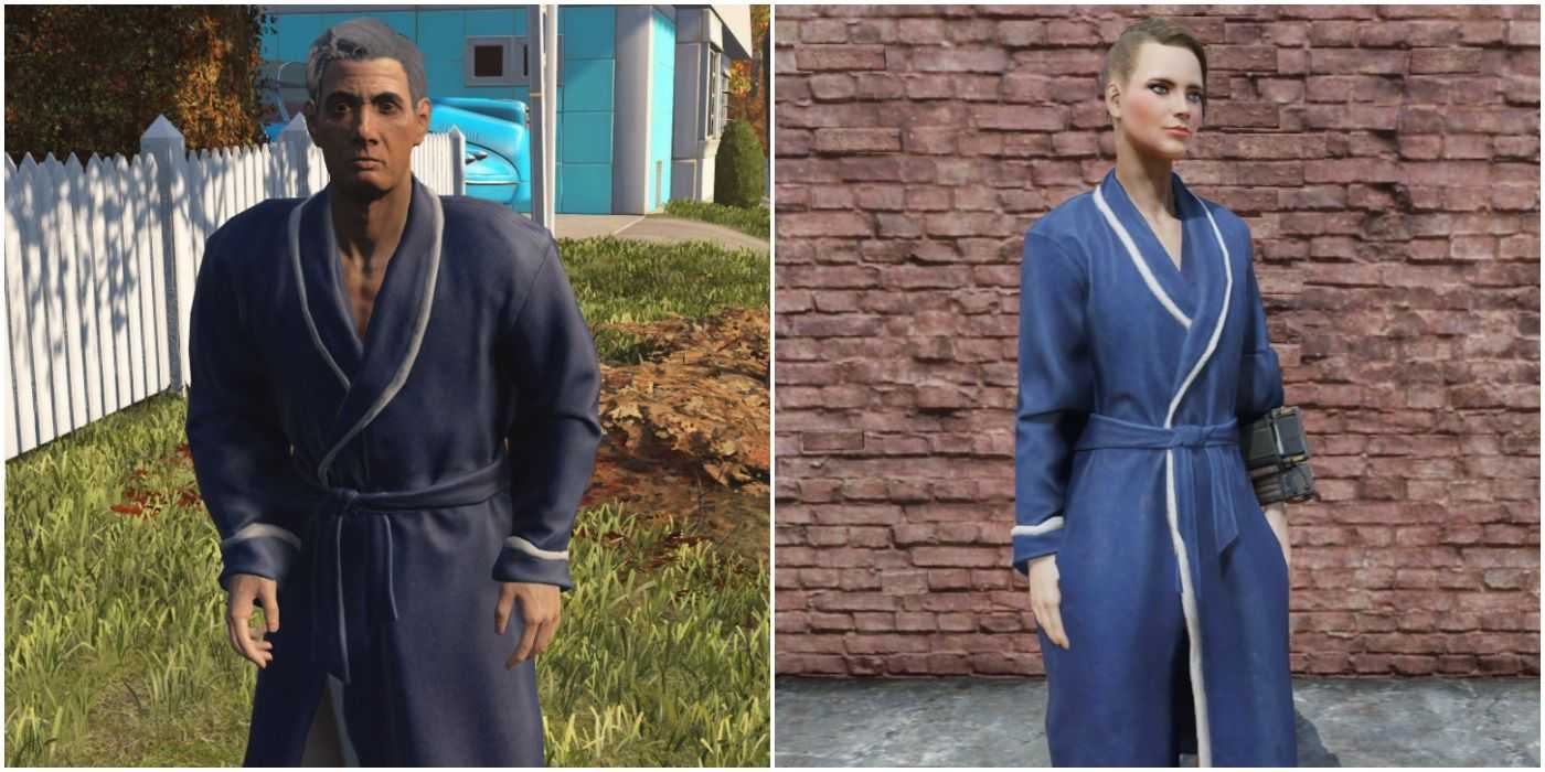 Вот так.Может показаться невероятным, что даже скромные удобства в виде хорошего халата являются редкой роскошью в постядерных пустошах Содружества, но это правда. Один из них можно увидеть у жителя Санктуари-Хиллз в прологе, и только один можно разграбить в основной игре, на Монсеньор Плаза.