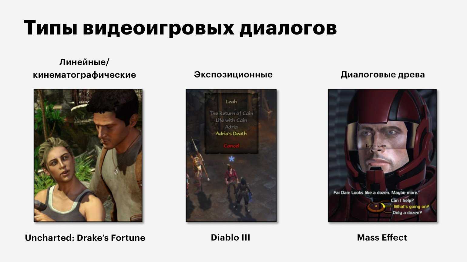 - Линейные, или кинематографические: игрок не влияет на ход разговора или развитие сюжета (пример: серия Uncharted).