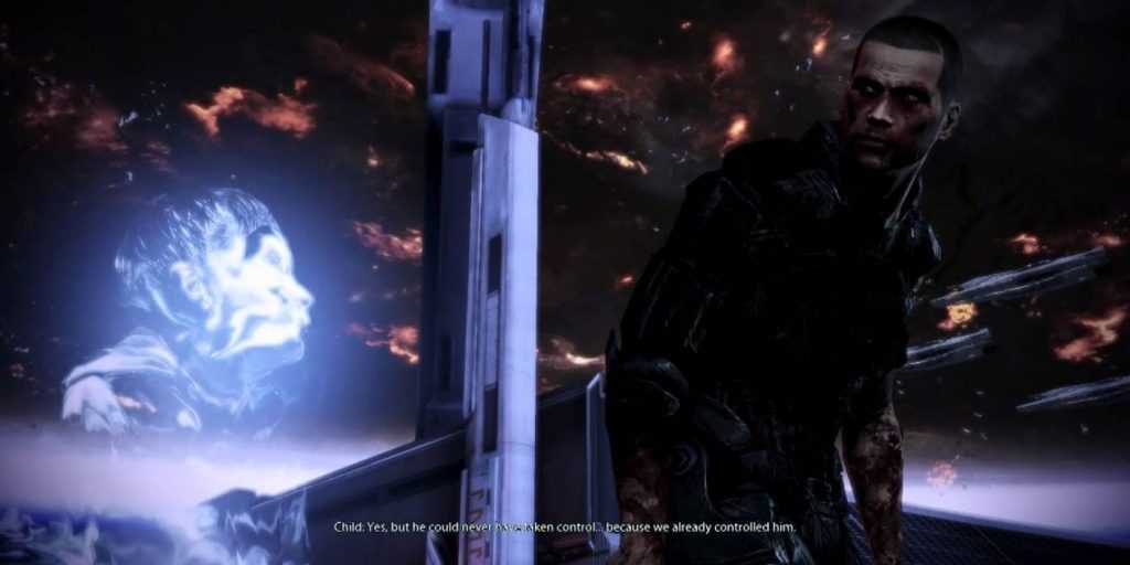 Самое интересное в этой концовке: она единственная, где милый ребёнок-катализатор вдруг заговаривает с Шепардом голосом Предвестника. Так мы узнаём, что всё это время общались не с каким-то незнакомым ИИ, а с самым старым жнецом, управляющим всеми остальными. Подобный исход событий вызывает вопрос об истинном создателе идеи «Горна» и заставляет пересмотреть всё сказанное мальчиком.