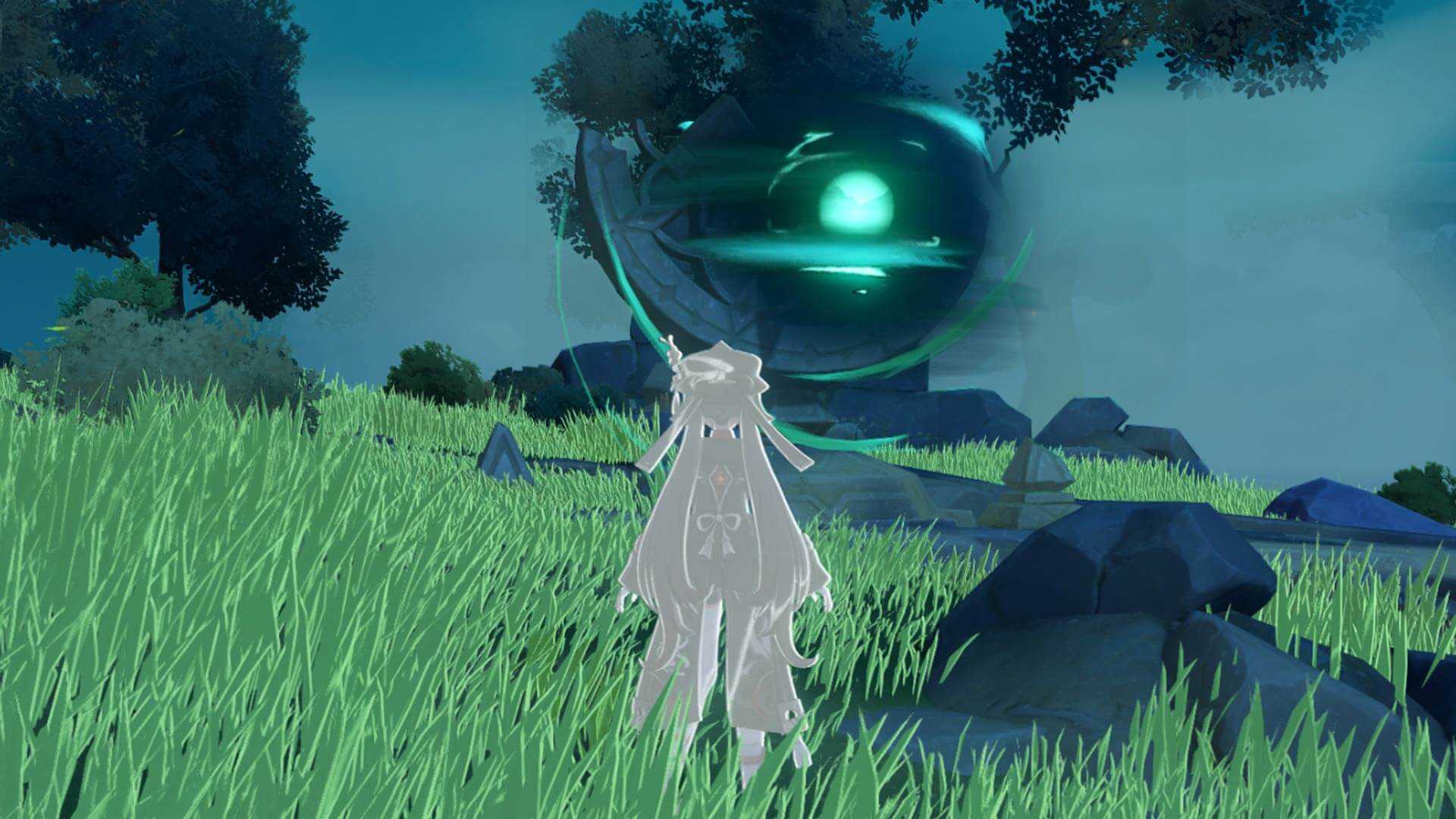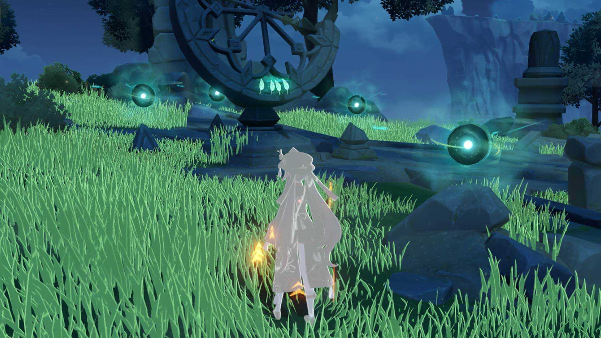 Идем к солнечным часам, перематываем время до двух часов ночи и активируем Чувство стихий. На солнечных часах появляются четыре Анемо лепестка, а также в стороны исходят потоки энергии. Эти потоки указывают путь до Анемо скоплений, которые выглядят как небольшие сферки. Появляются они только с двух до пяти часов ночи, поэтому если нужное время прошло (Паймон об этом скажет), снова перематываем его.