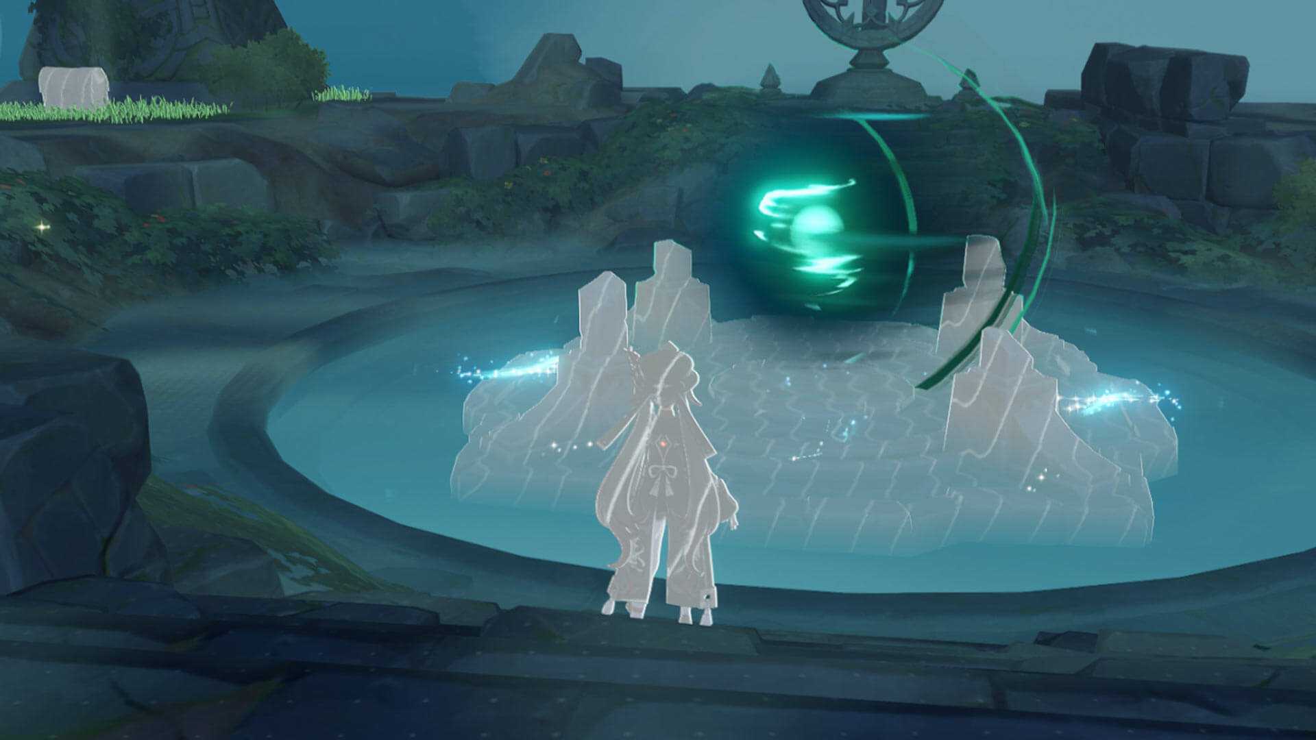 Вы достигнете деревянного моста, проложенного через водопад. Загляните под него, чтобы отыскать геокул. Вы также можете использовать Крио умения на монументах за водопадом, чтобы разблокировать сундук. Вам предстоит двигаться очень быстро и, скорее всего, использовать как минимум двух Крио персонажей или активировать взрыв стихии Кэйи.
